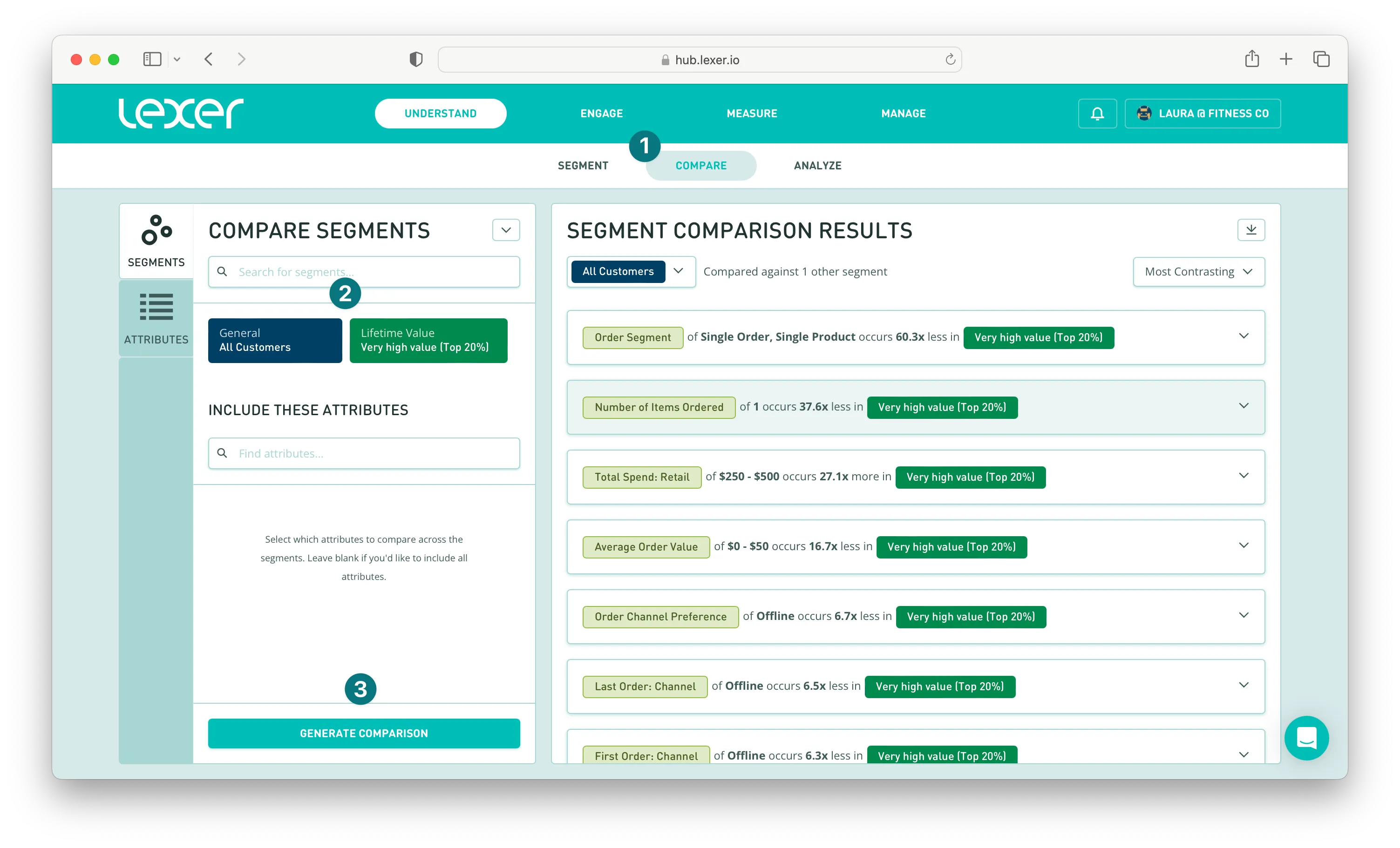 Simply navigate to Compare > Segment, and then add your segments to the comparison. Click Generate Comparison and you'll get your results.
