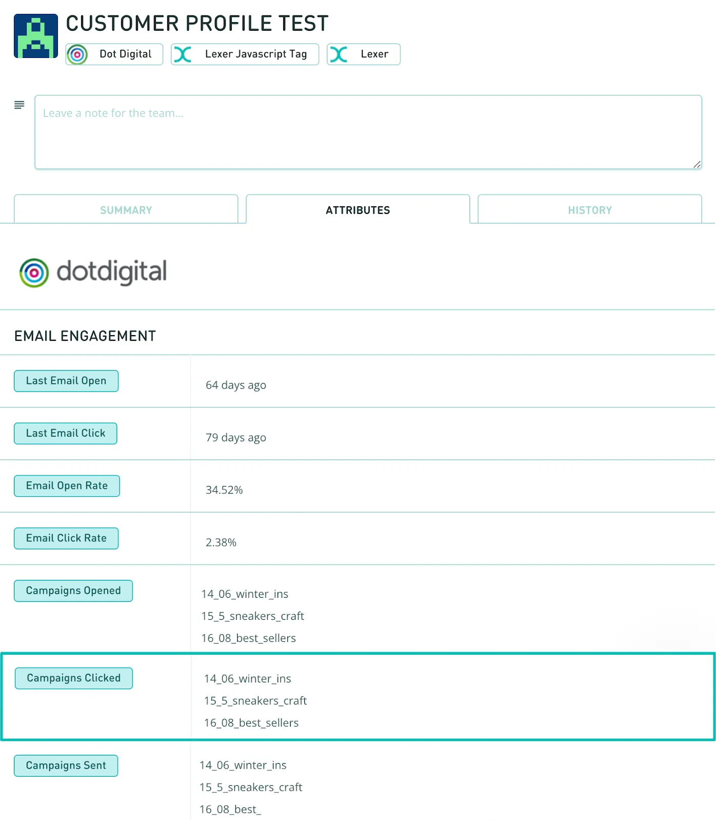 When you activate a campaign the profiles that are impacted by the change will have several campaign attributes attached to their profile. One of these attributes will be the Campaign Clicked attribute (shown above) which will list all of the campaigns the profile has interacted with by clicking on a link.