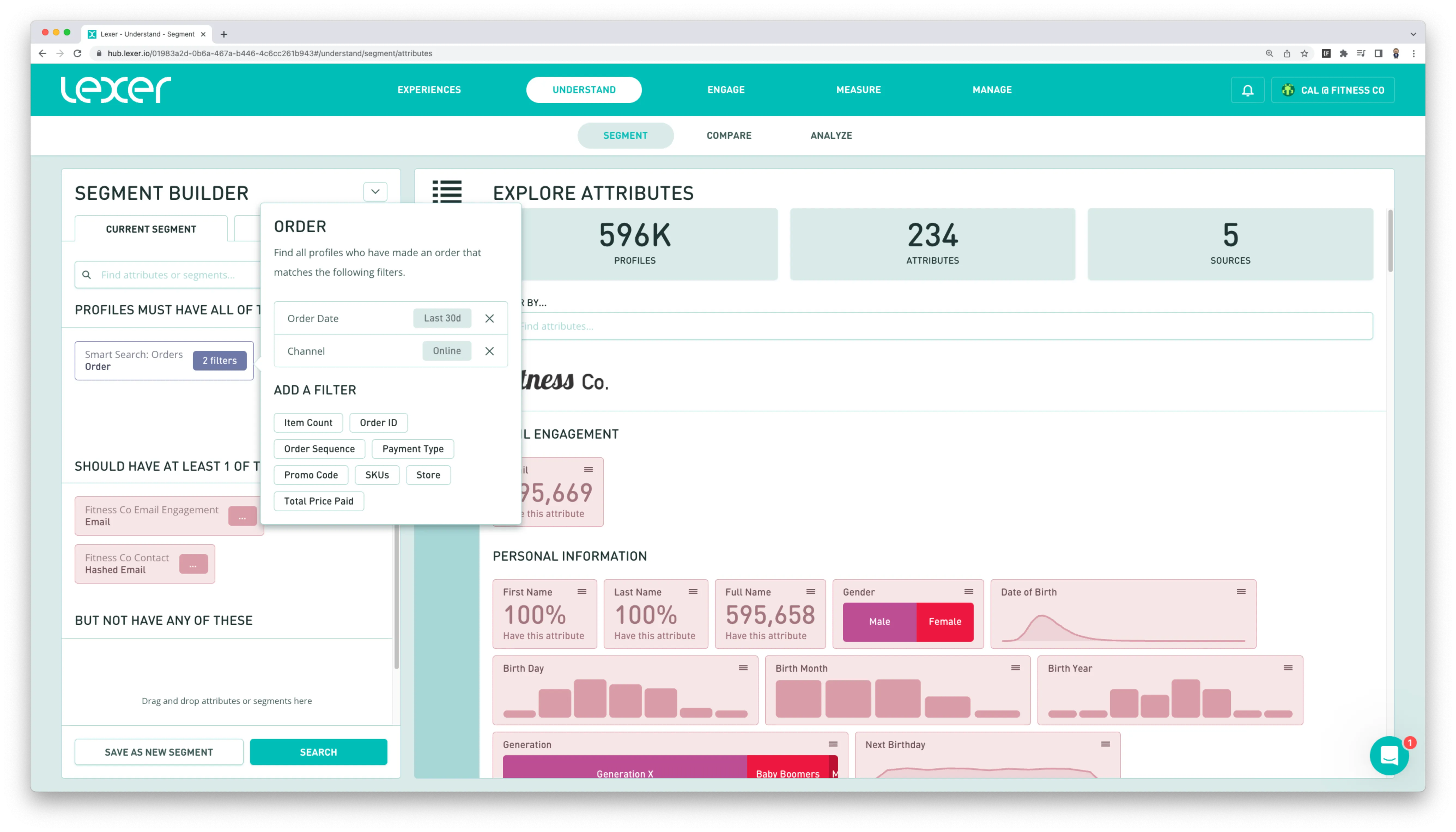 4. Add the Order attribute from our Smart Search feature. Within the Order attribute add Order Date > Last 30 days, and the Channel filter > Online.