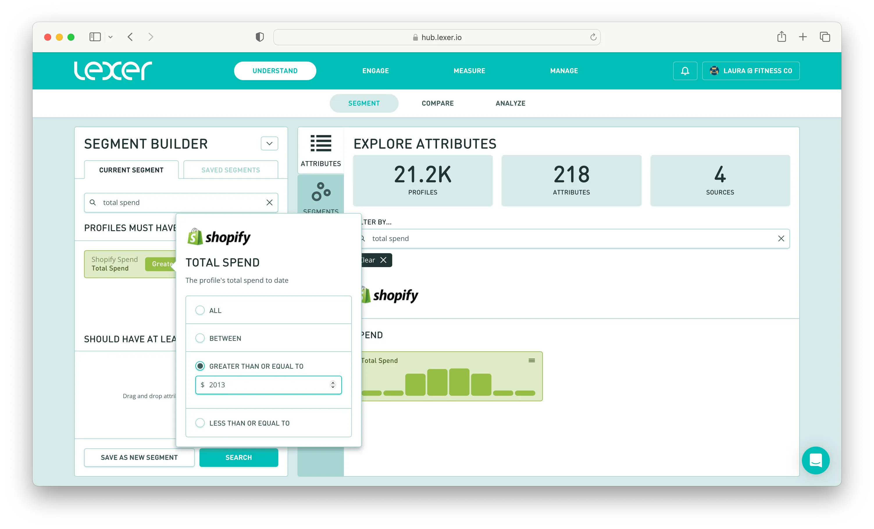 So, to narrow this down to your top customers, clear the Segment Builder and add the Total Spend attribute to the PROFILES MUST HAVE ALL OF THESE section of the builder. Then filter for Greater than or equal to > $2,013. Hit Search.