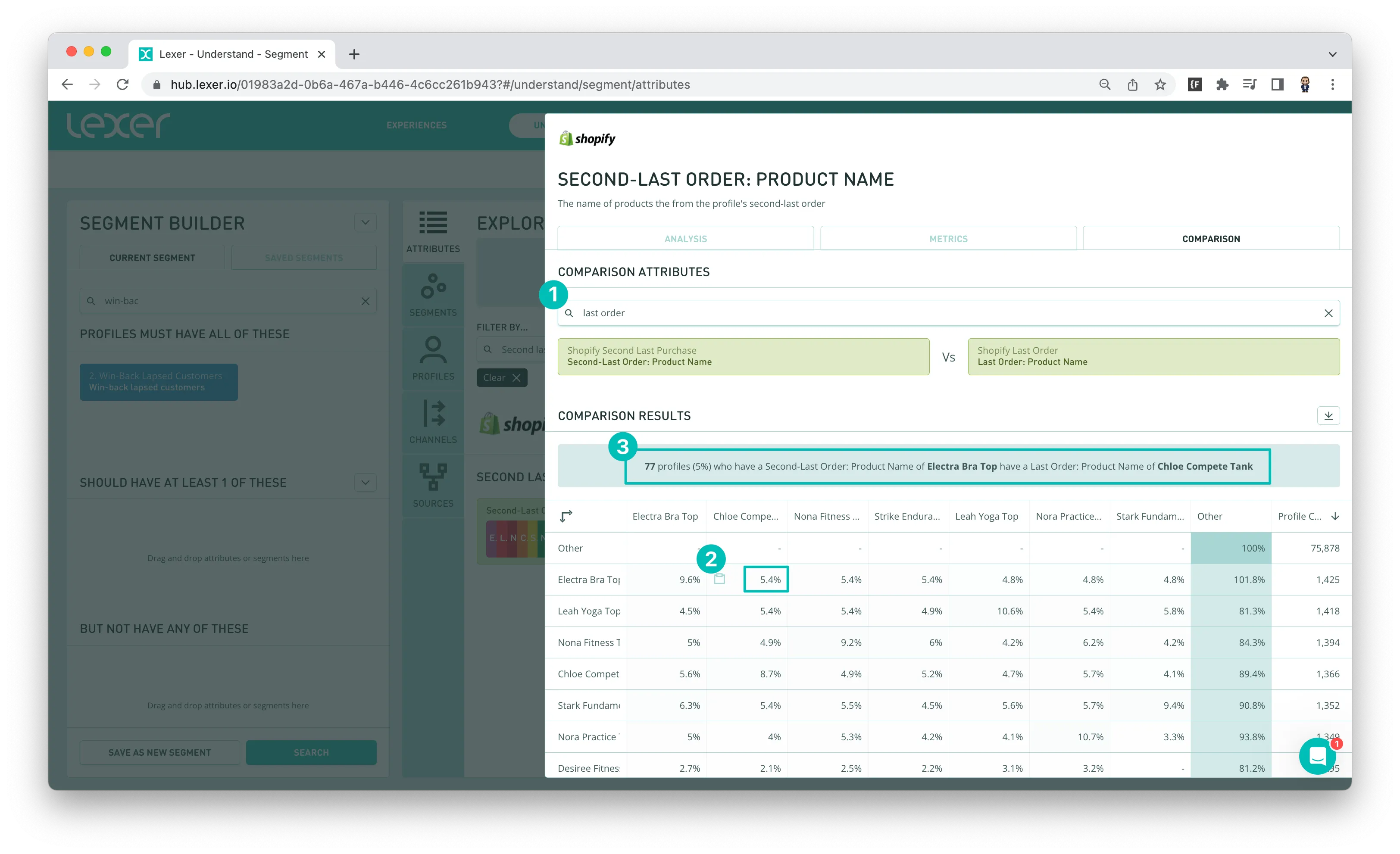 For example, if you build a win-back campaign segment, you can then see what products your customers are purchasing in their second-last order, before going on to purchase again and being "won-back". You can then use these insights to develop more targeted and personalized messaging for your win-back campaigns and strategies.