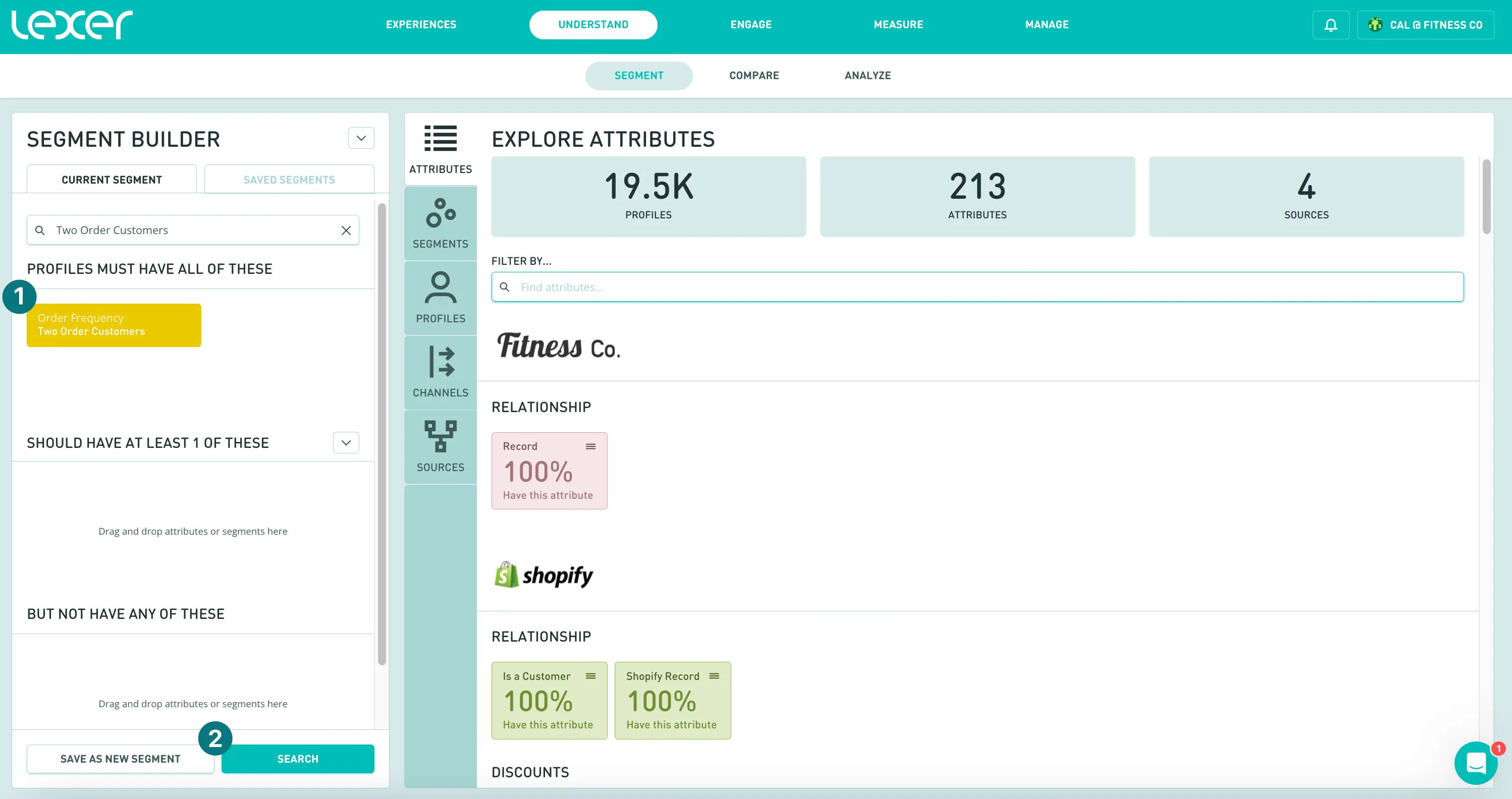 To gather the information you need, head over to the Segment Builder and then add the following out-of-the-box segment to the PROFILES MUST HAVE ALL OF THESE section of the builder: Two Order Customers. Hit Search.