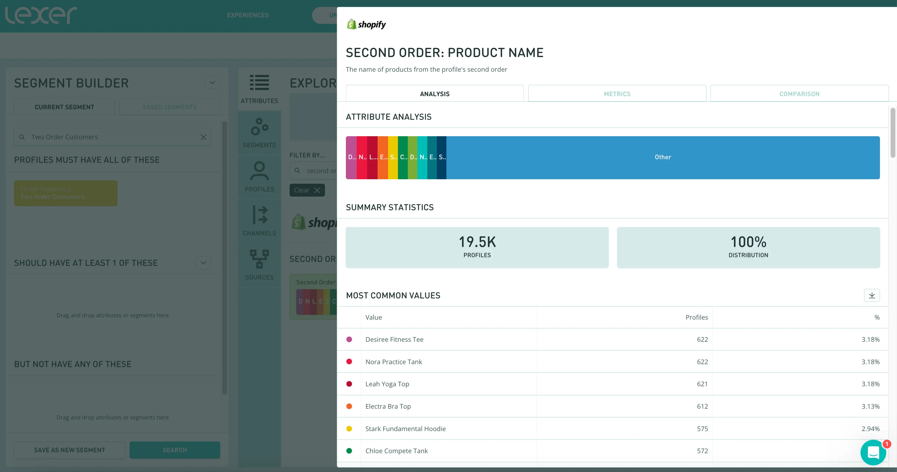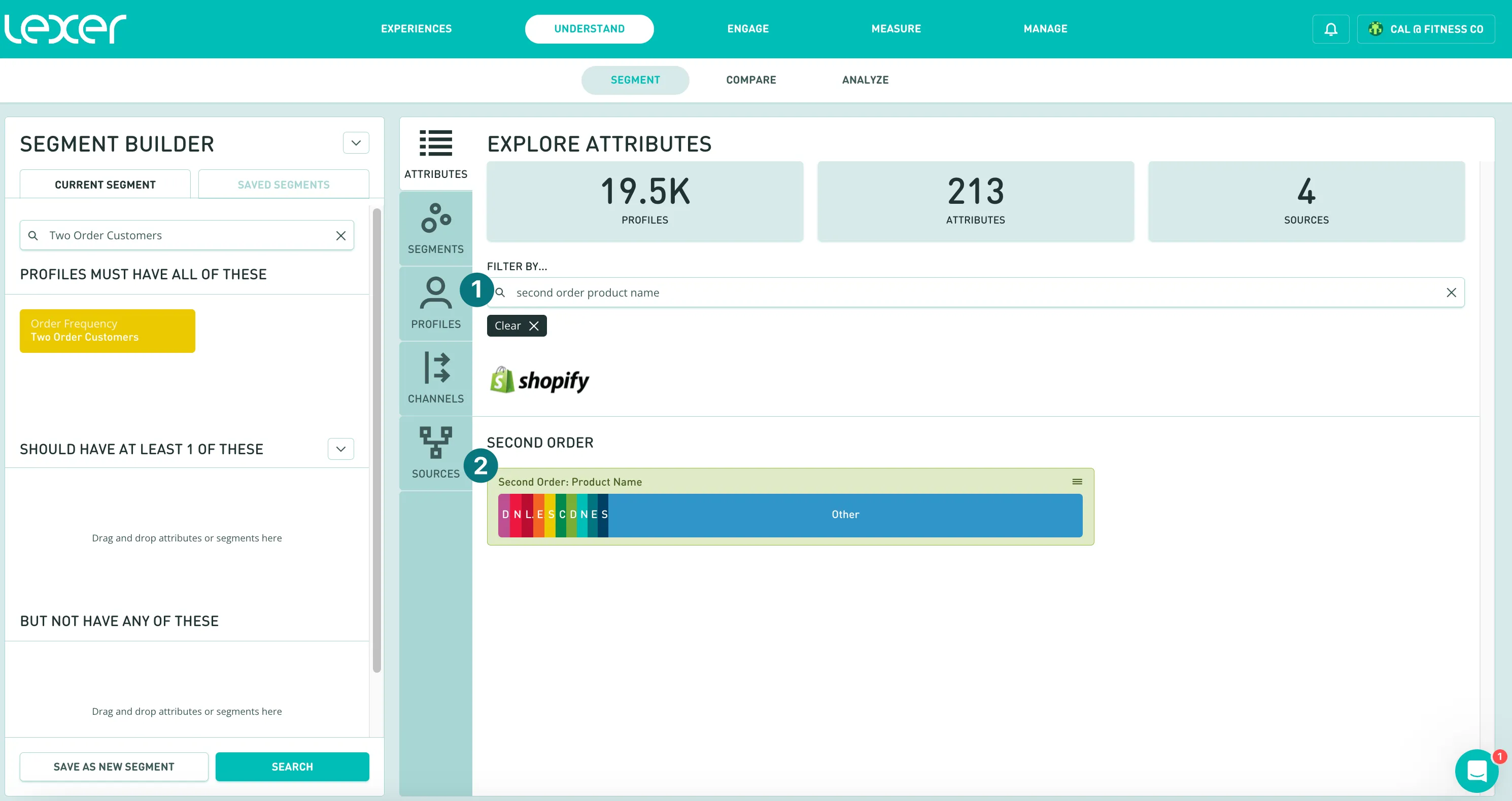 To do this, move to the right of the Segment Builder and then filter by Second Order: Product Name. You can click on this attribute to see a breakdown of the products most frequently purchased.