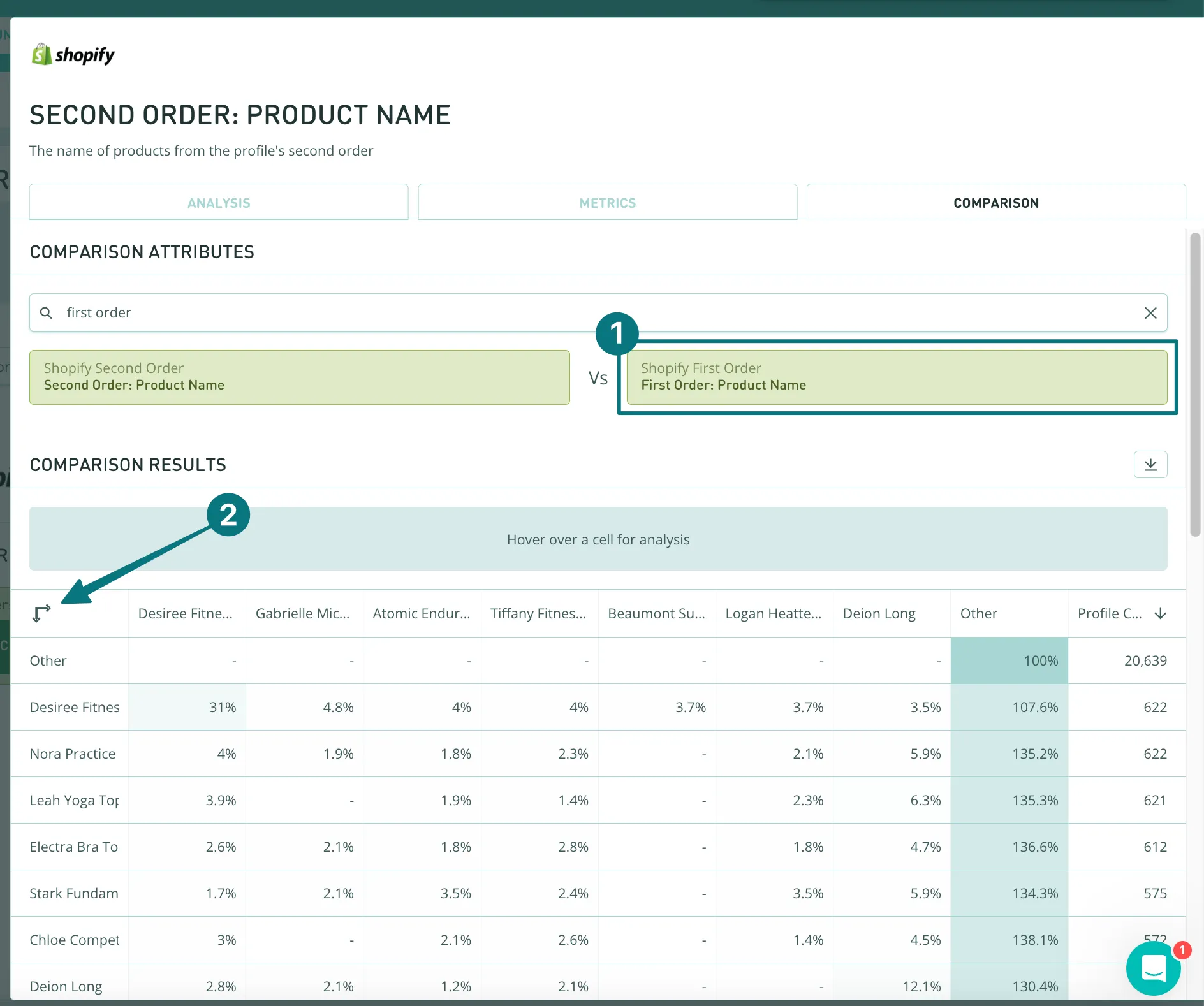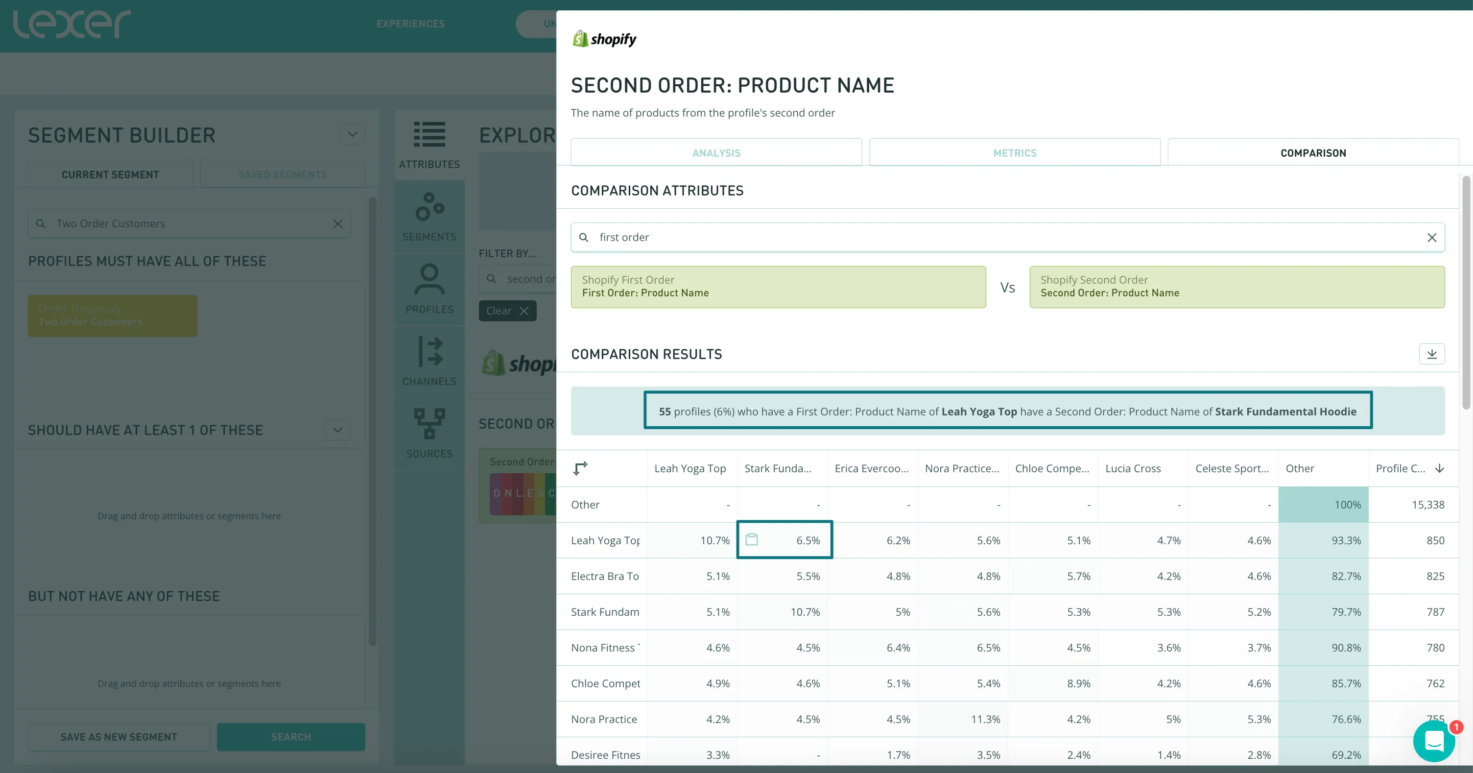 Your results will then show you a detailed breakdown of what your customers bought in their first order, compared to their second order. For example: we can see that "55 profiles (6%) who have a First Order: Product Name of Leah Yoga Top have a Second Order: Product Name of Stark Fundamental Hoodie".