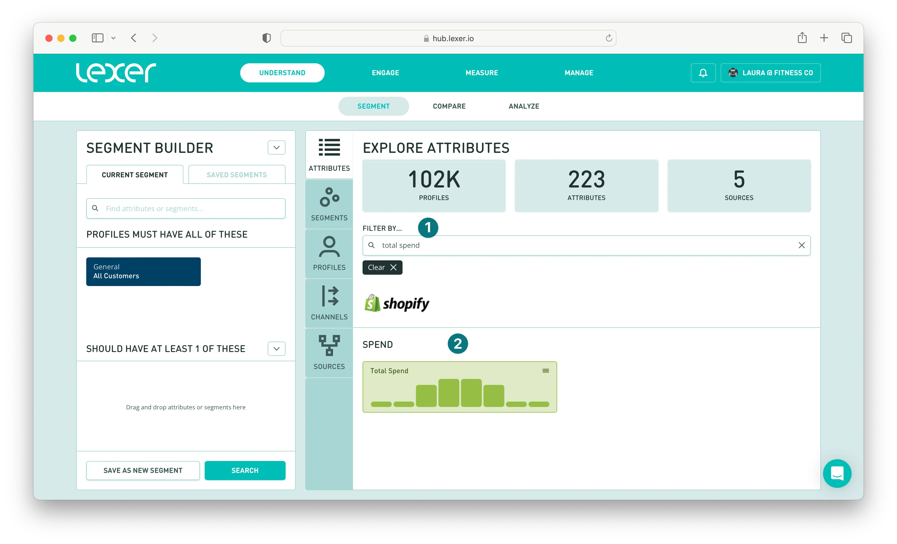 Now, move to the right of the Segment Builder, and under EXPLORE ATTRIBUTES filter by Total Spend. Click into this attribute.
