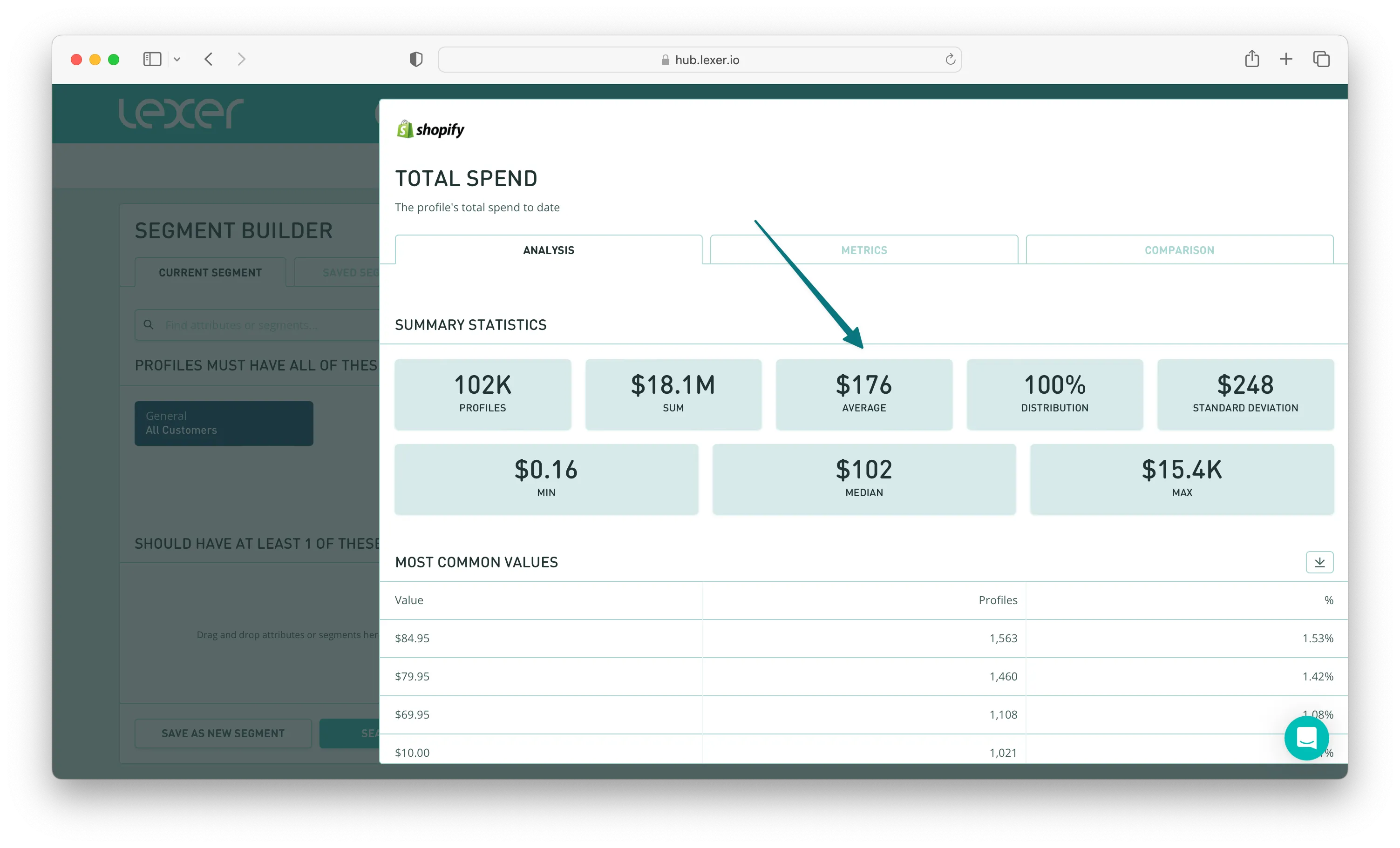 Once you've clicked on the attribute, scroll down to Summary Statistics and you'll find the average total spend across your whole customer base. In this example it's $176.