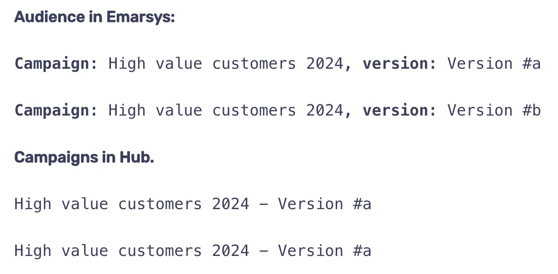 Want to delve deeper into your campaign audiences from Emarsys, now you can with a more granular ability to differentiate audiences sent from Emarsys. Emarsys A/B testing campaigns for example were being recombined when sent to the Hub. We have adjusted this so all audiences have distinct names that differentiate them from one another in the Hub. Read more about this update and how these A/B splits are presented in the Hub in our Emarsys Learn article.