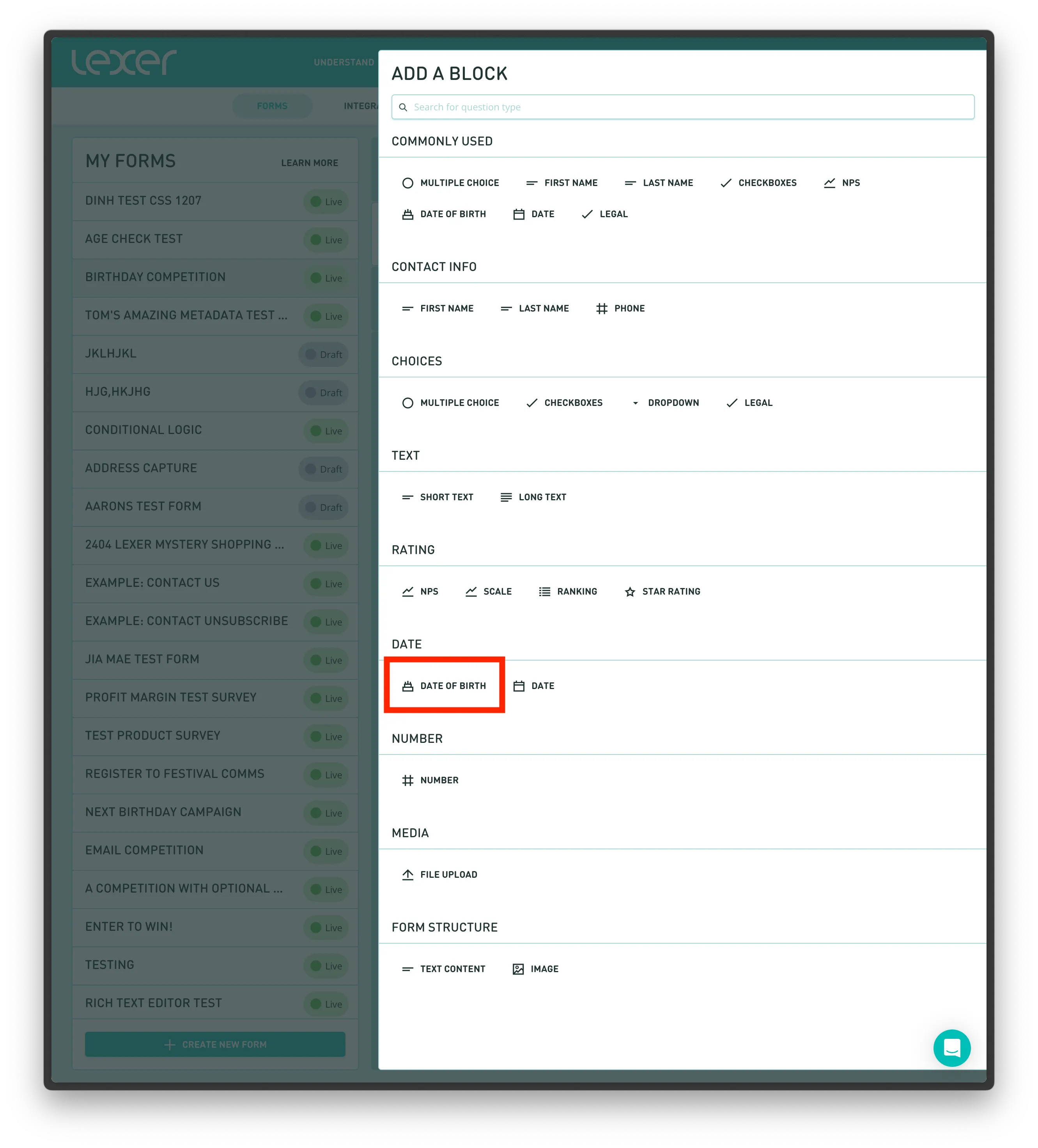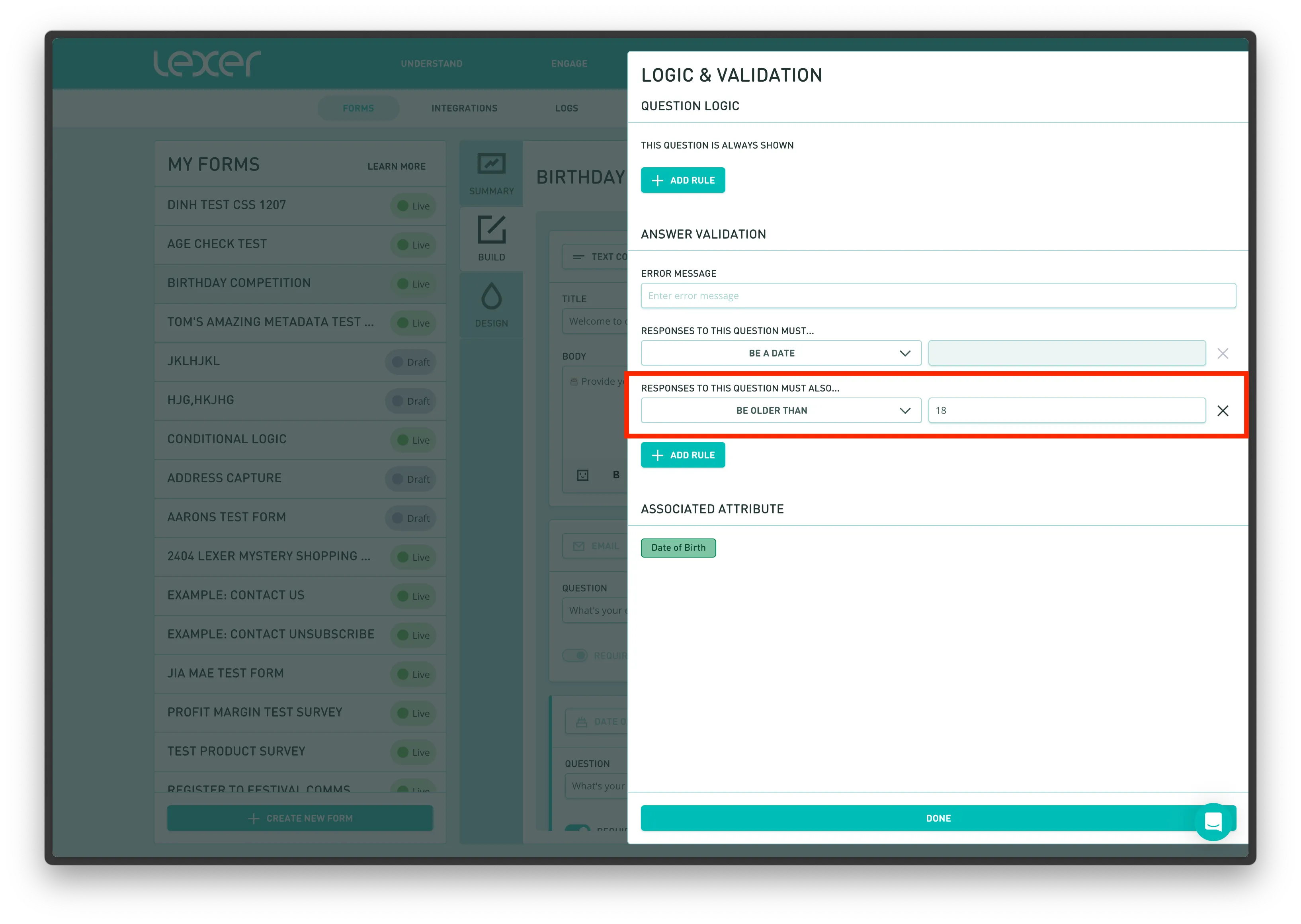 Forms now supports “Date of Birth” question types that map responses to the standard Date of Birth attribute. Supports multiple forms all writing to this single attribute, improving data quality. https://learn.lexer.io/docs/create-build-and-design-forms