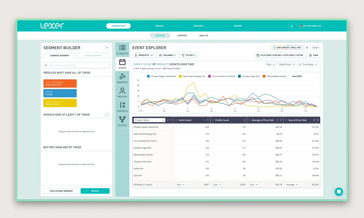 Event Explorer is a powerful insights feature that puts customer event data at your fingertips. This tool allows you to analyze customer actions over time—such as orders, products purchased, and interactions—without requiring specialized BI tools, coding knowledge, or assistance from data analysts. https://learn.lexer.io/docs/event-explorer