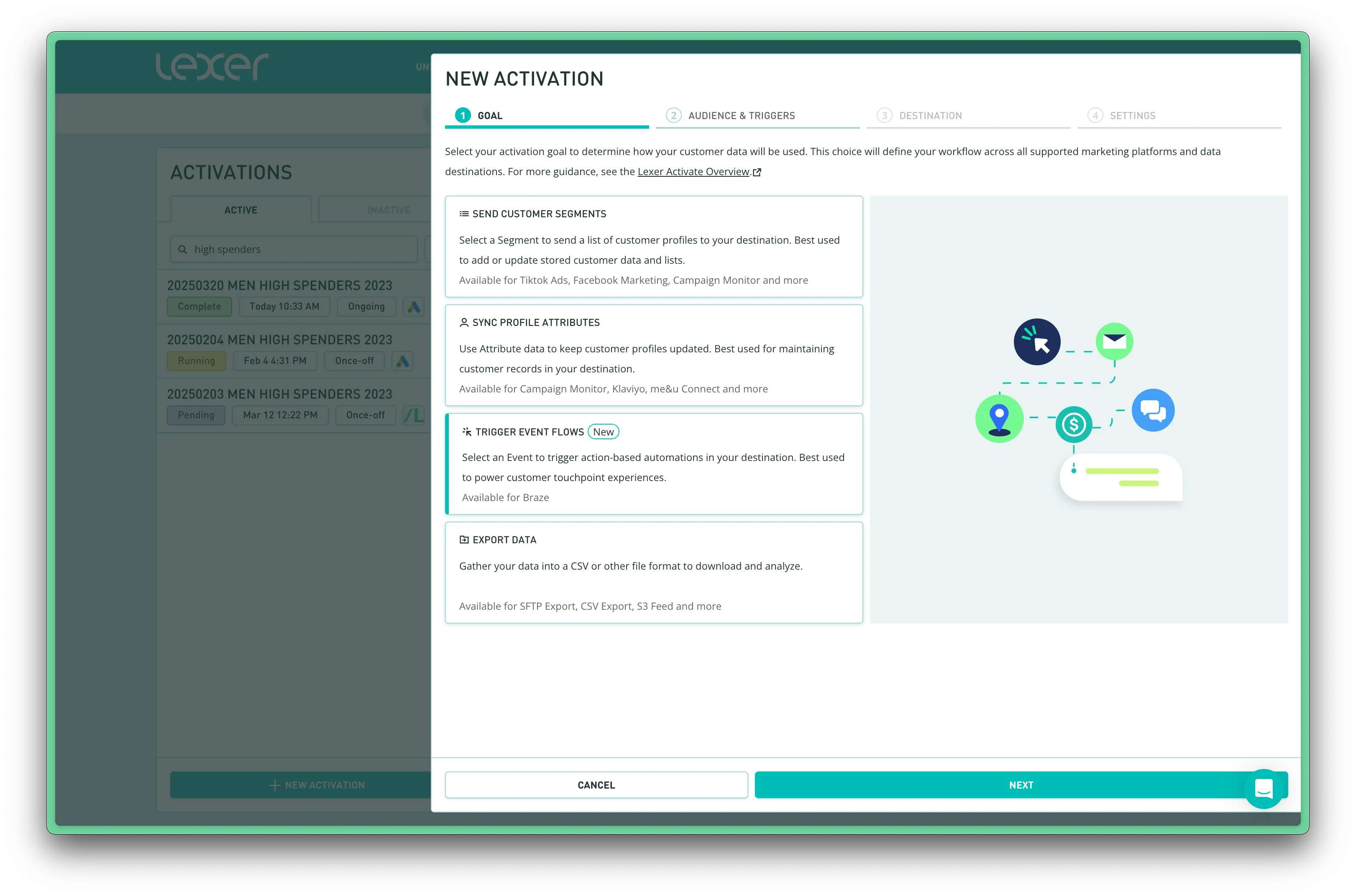 Lexer Activate enables you to connect your customer data to marketing tools for more personalized messaging. Event activations are triggered when specific customer actions—like purchases or visits—are detected in your data. These activations send individual event records to your chosen platform, making it easier to respond to key customer behaviors. https://learn.lexer.io/docs/event-activations