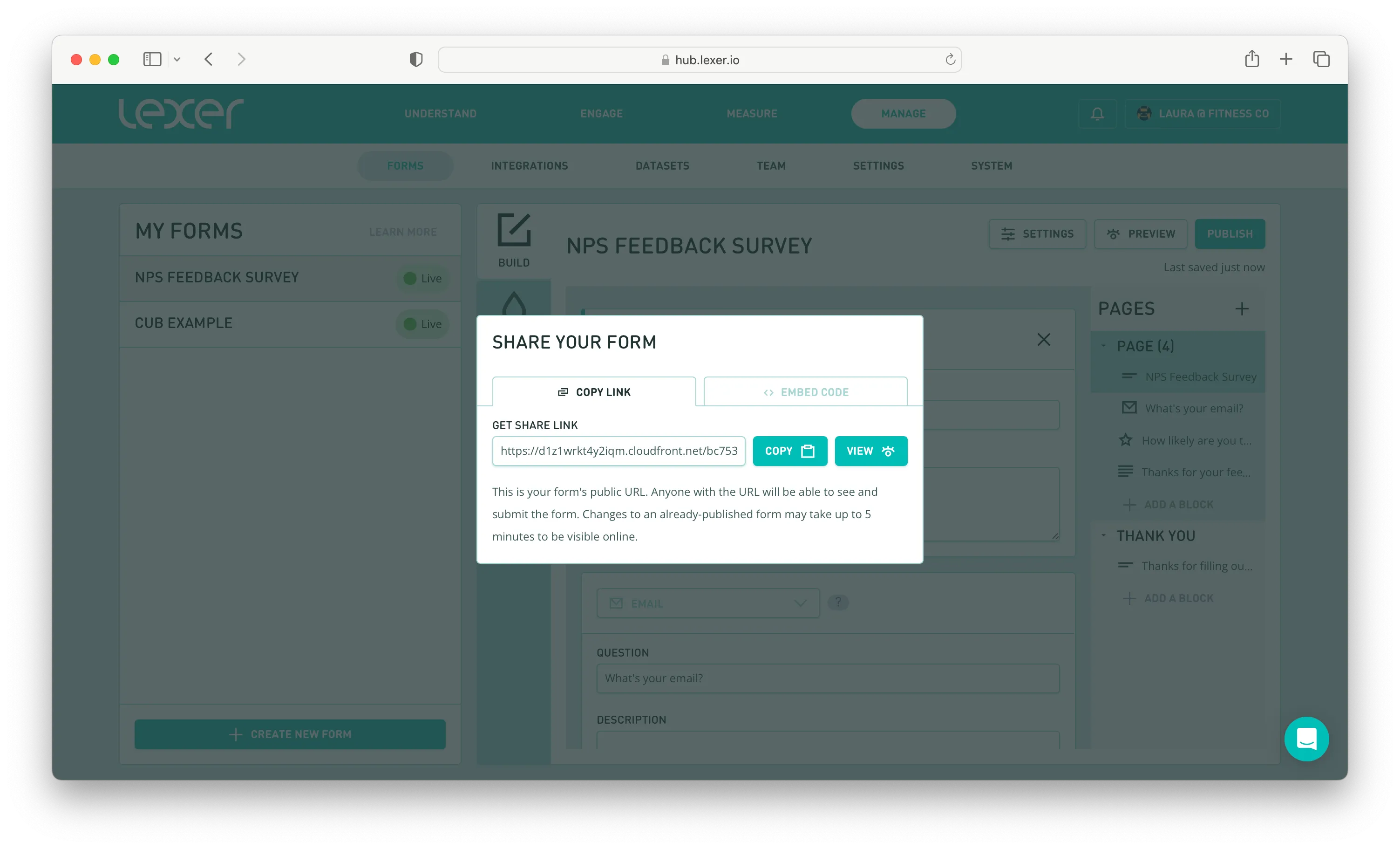 Once a form has been published successfully, a popup will appear with two tabs. One tab will contain the Share Link to the form. This link is a public URL and can be sent to your customers for example via email.