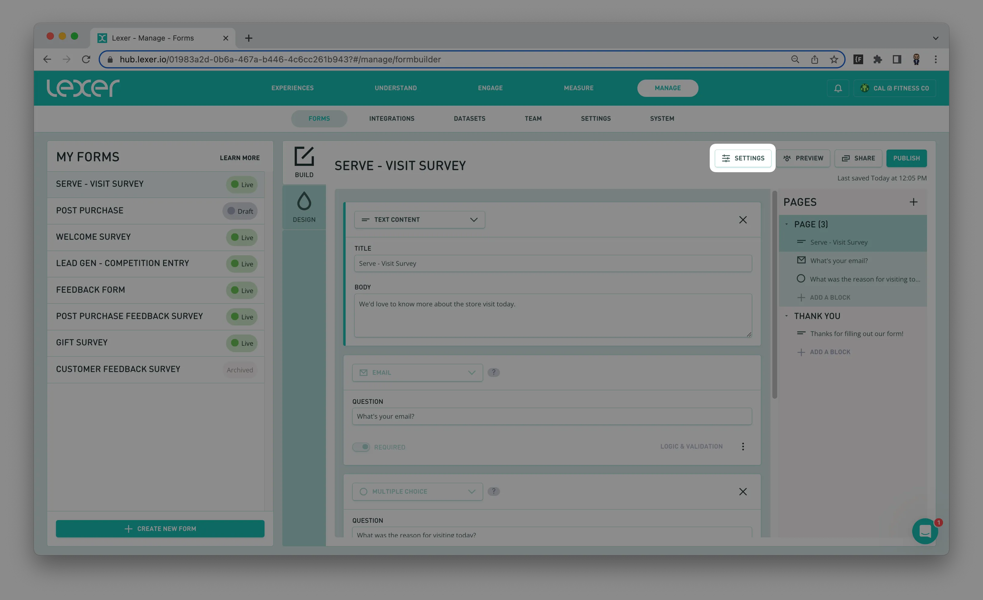 Form settings can be located in the From Builder. Within settings, you can adjust the name, add a privacy policy URL and label, adjust the permissions required to view and edit the form, and adjust the meta data. To find forms, navigate to Manage > Forms, open the form that you would like to adjust then click on Settings, which can be found next to the title of your form.