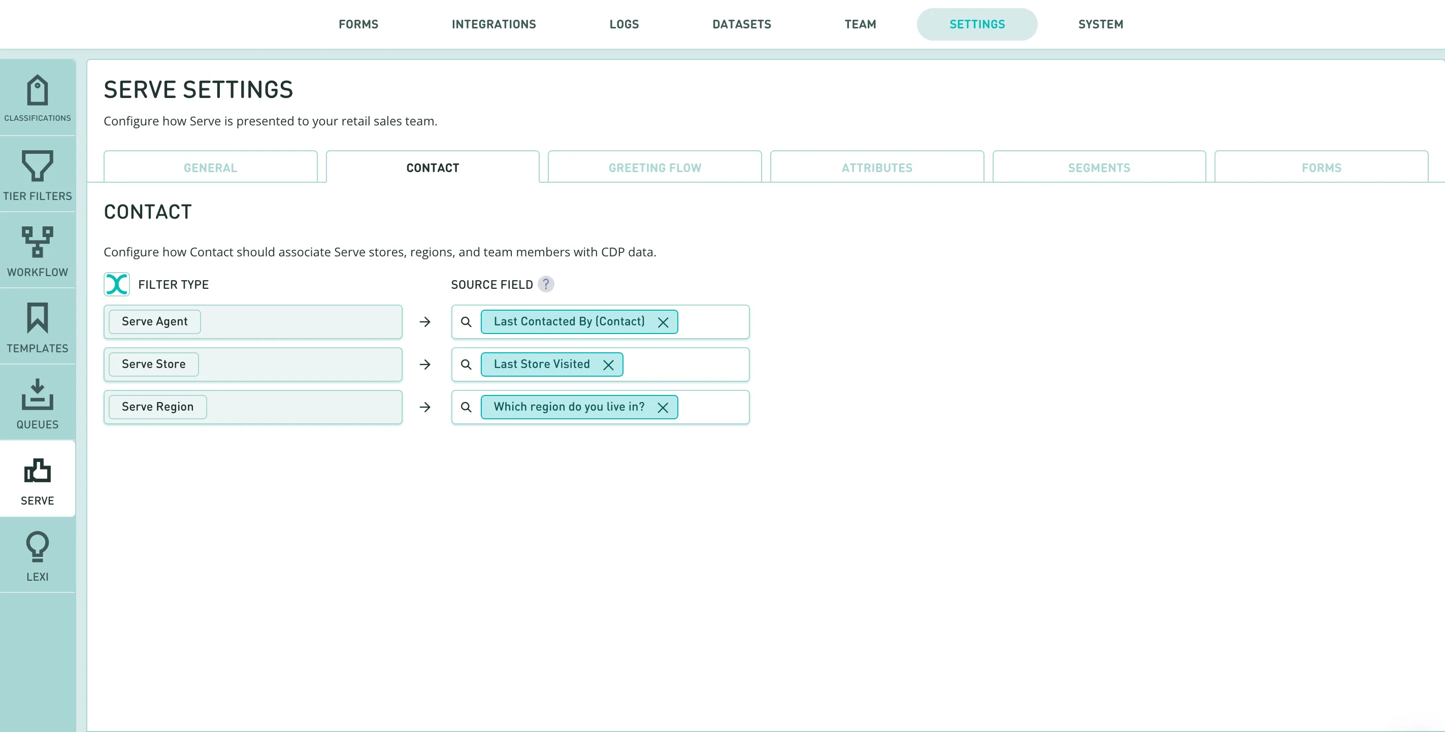 To configure filters, go to Manage > Settings > Serve > Contact. Here, you can select the source field for each filter type. For instance, if you select the Last Contacted By attribute for Serve Agent, the system will match customers to agents based on this criteria. Similarly, if you choose Last Store Visited for Serve Store, the system will match this data from the customer profile to the corresponding store location in Serve. The same logic applies to Serve Region.