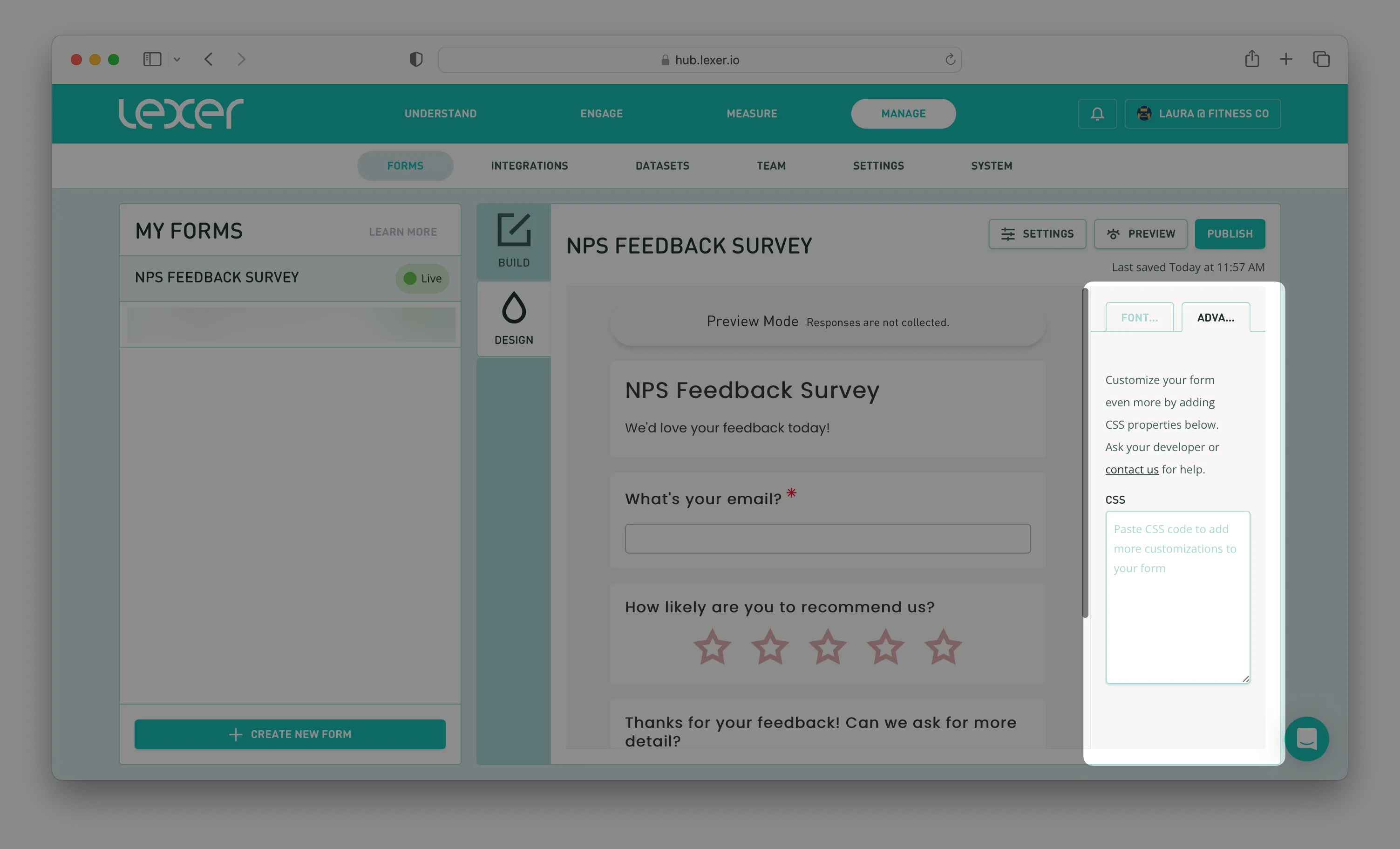 Once you’ve finished building out your new form you can move onto the design and choose your fonts, logos, colors, and more. You can even add custom CSS if you want something personalized to your brand.