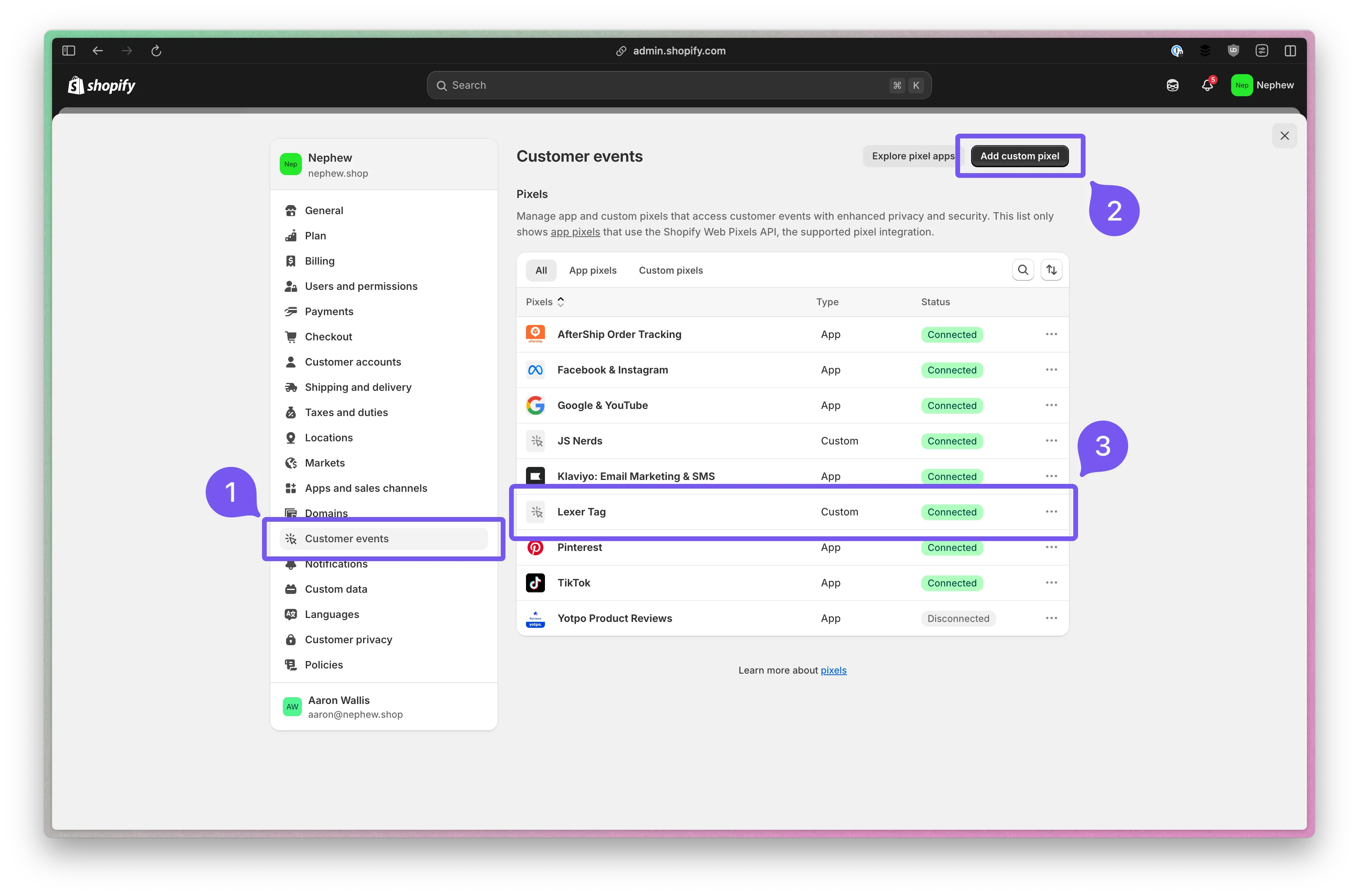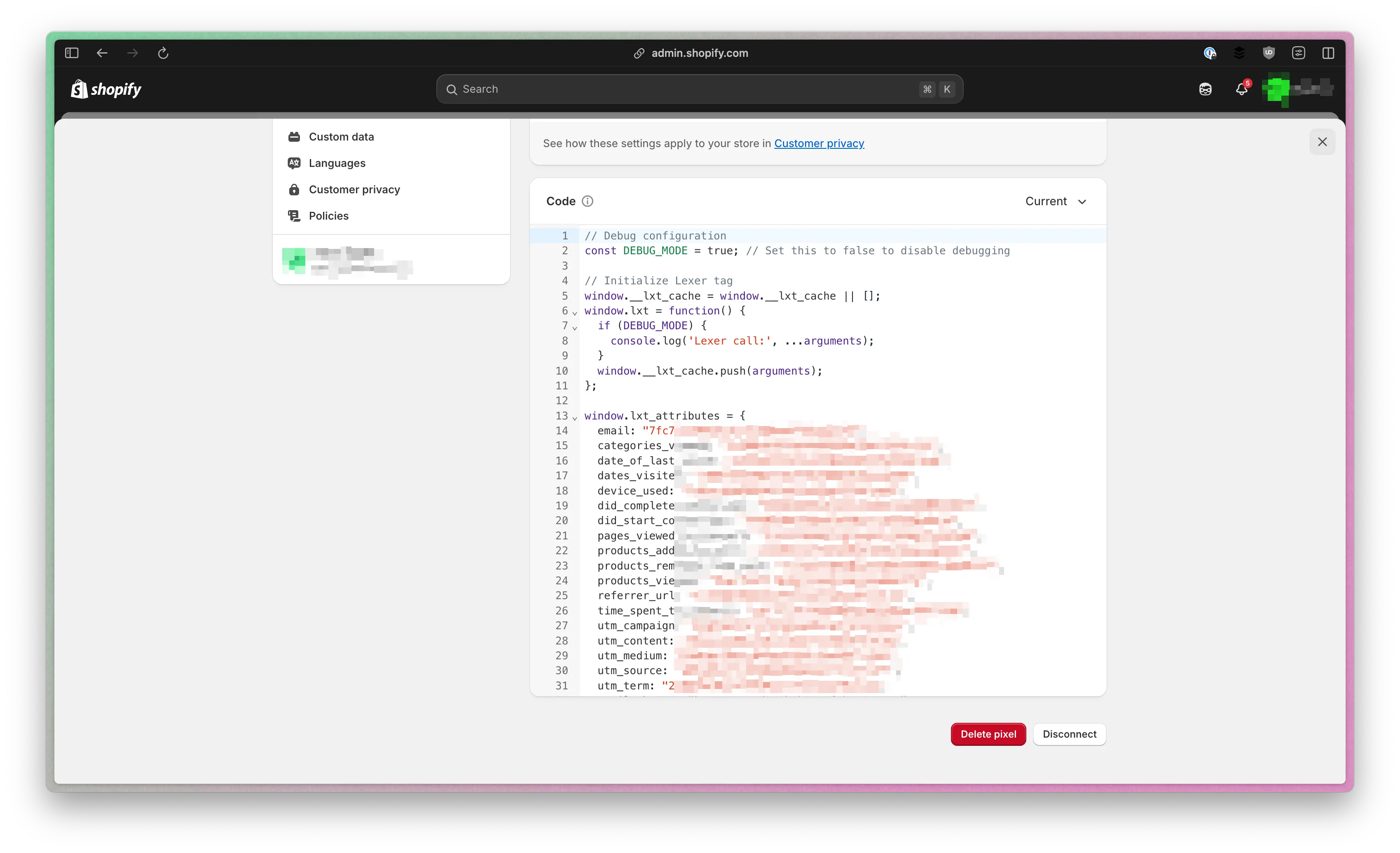 The Lexer Javascript Tag enables customer tracking and analytics integration between your Shopify store and the Lexer Customer Data & Experience Platform (CDXP). This guide walks through the installation process using Shopify's Custom Pixel feature.