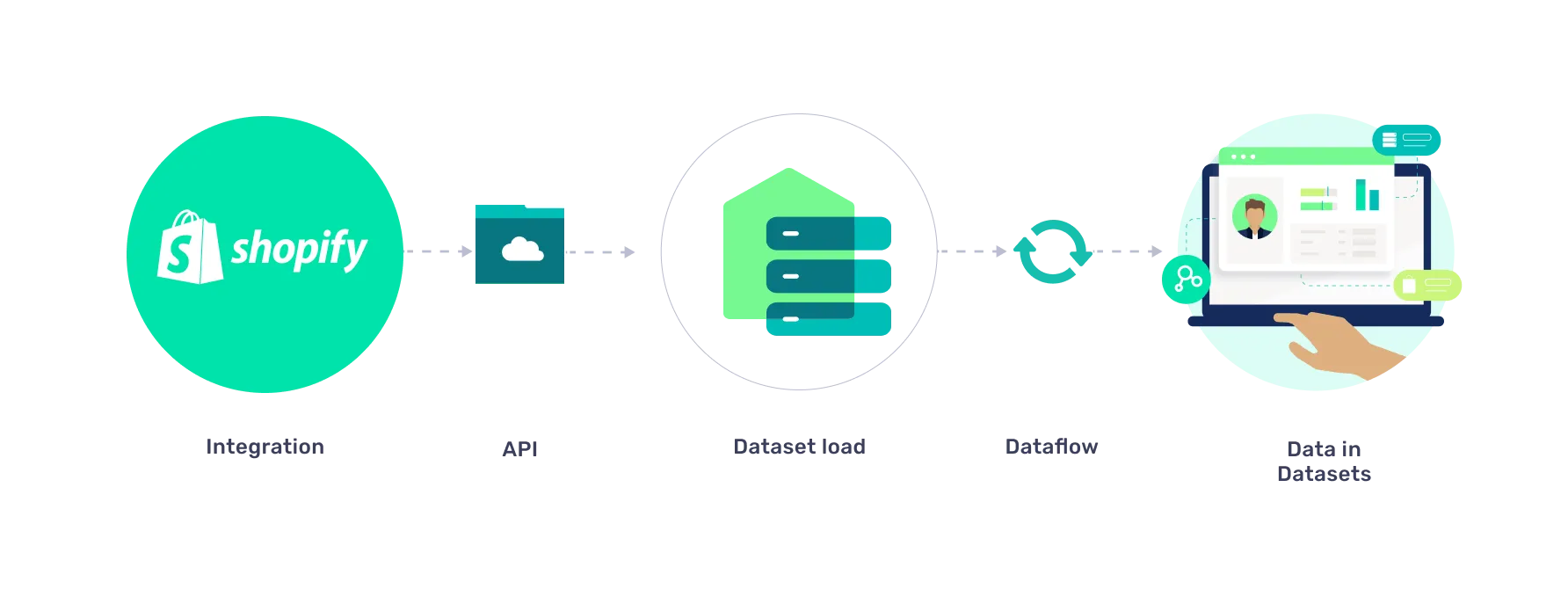 - The raw data from Shopify is loaded into an Amazon S3 bucket via a Dataset load.