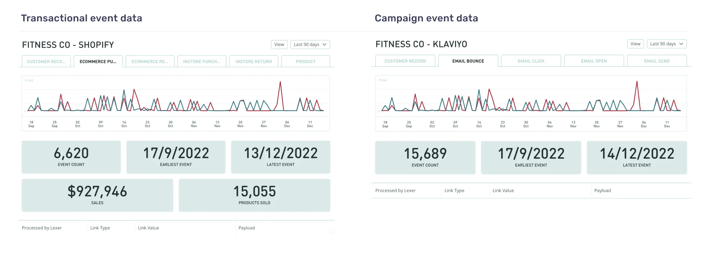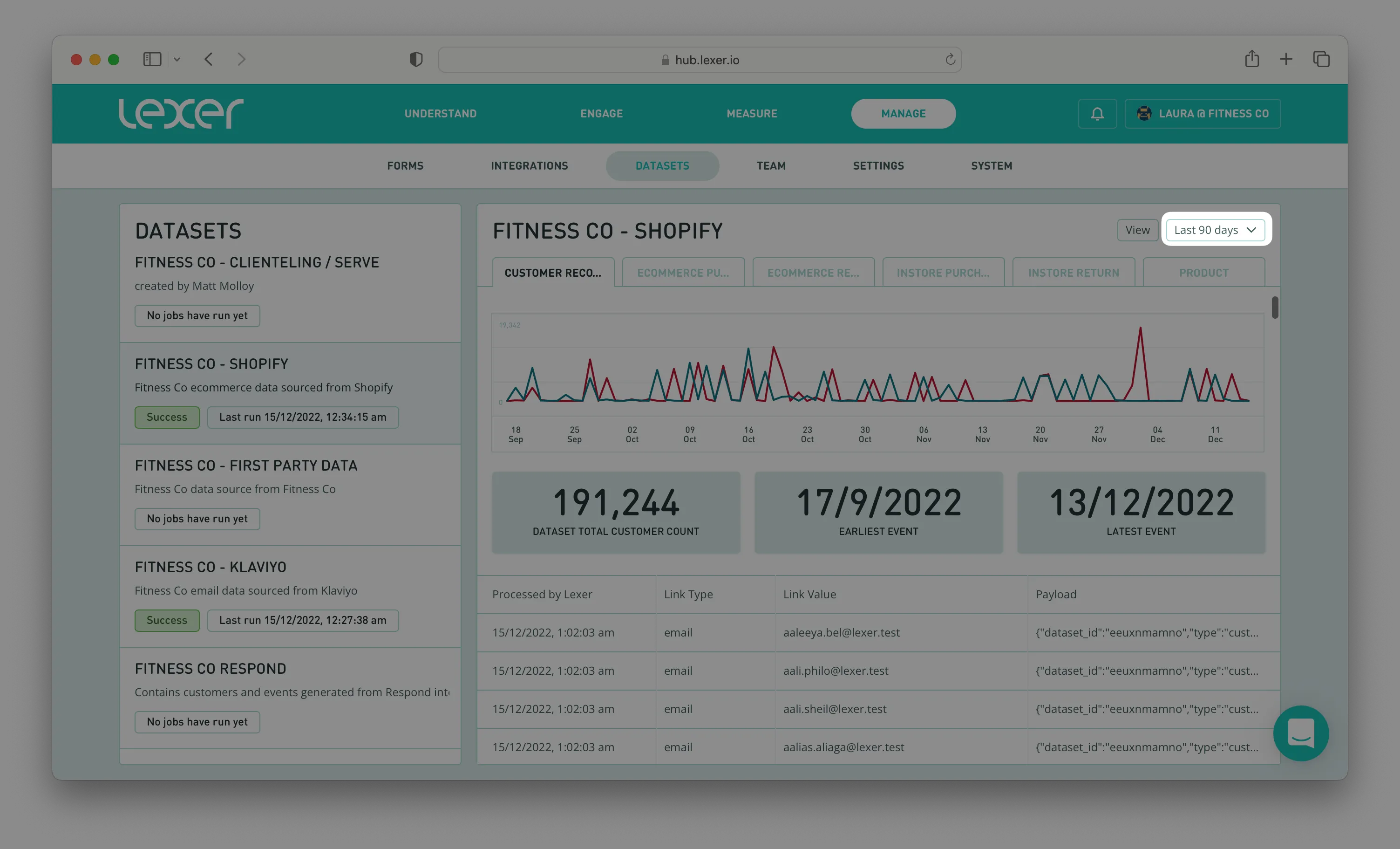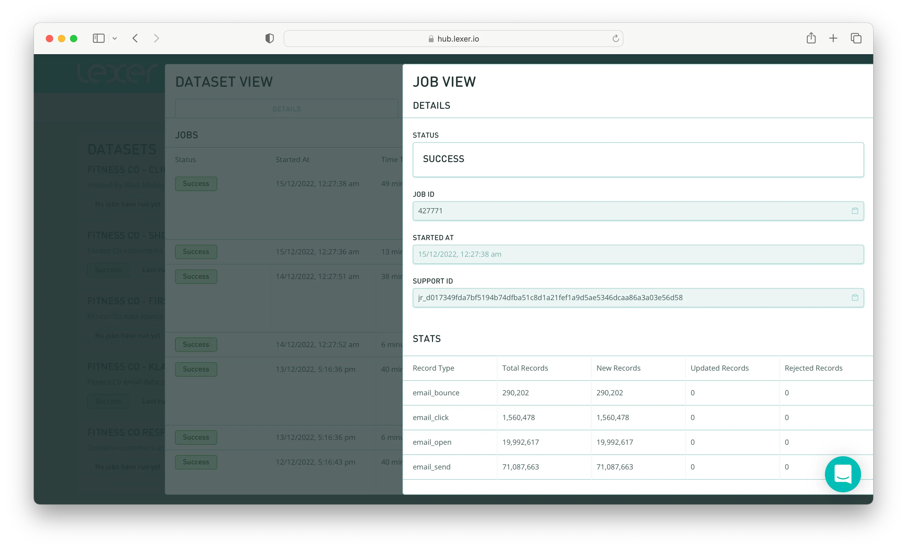 Lexer’s Datasets lets you quickly view and validate the health of your integration feed, including data continuity, volume, and freshness of data flowing into your datasets. Drilling down even further, you can click into each record to view the payload for individual customer records.