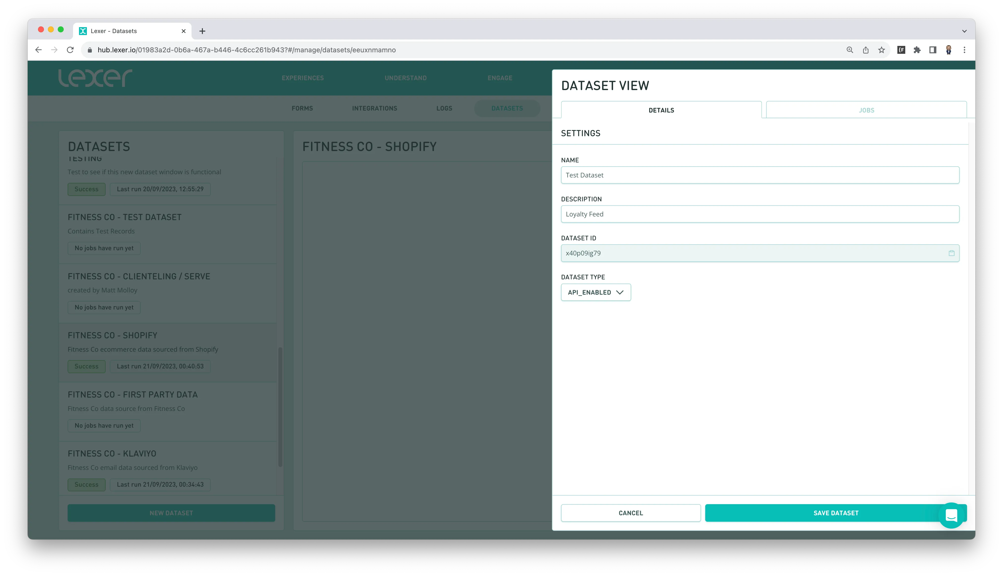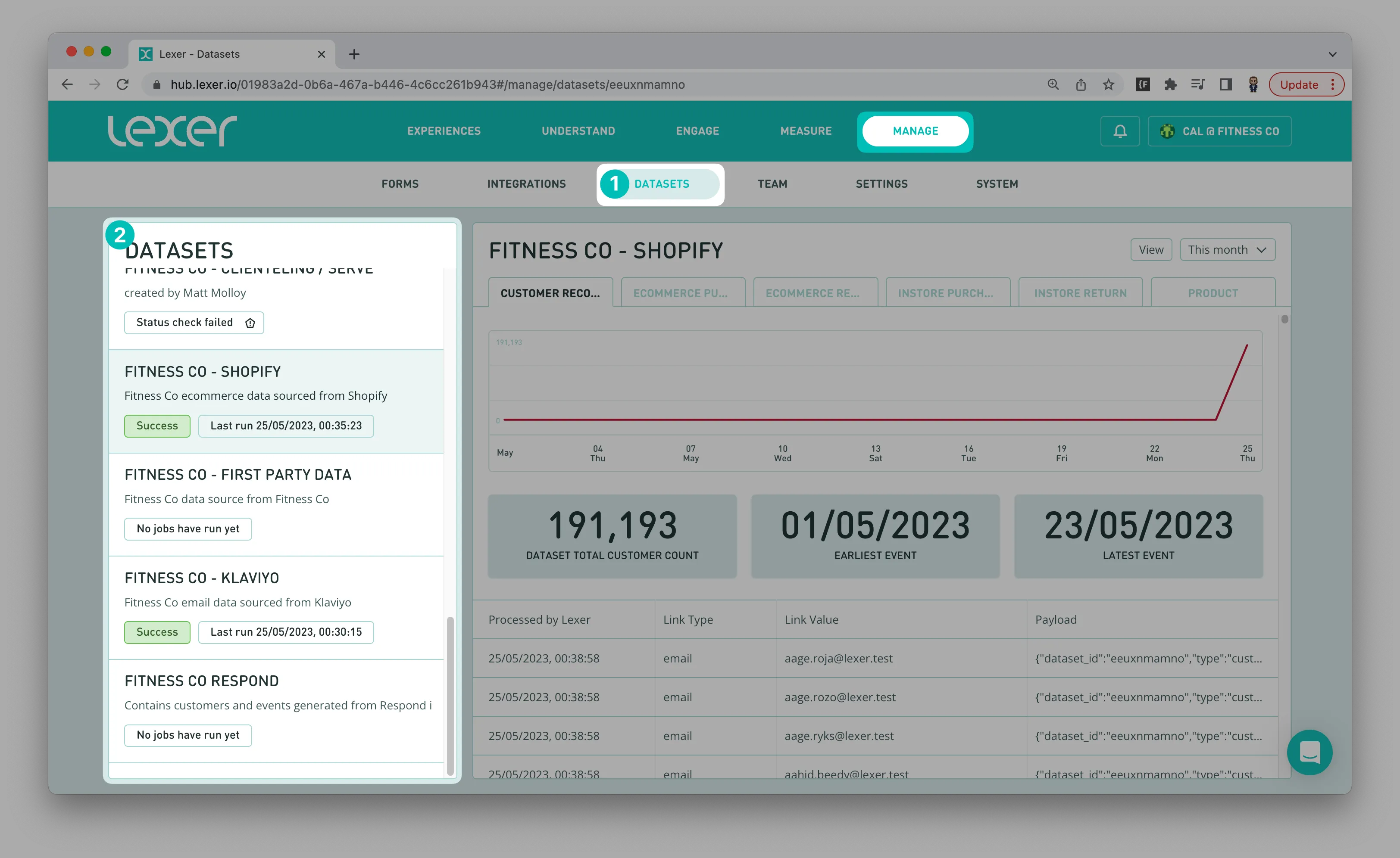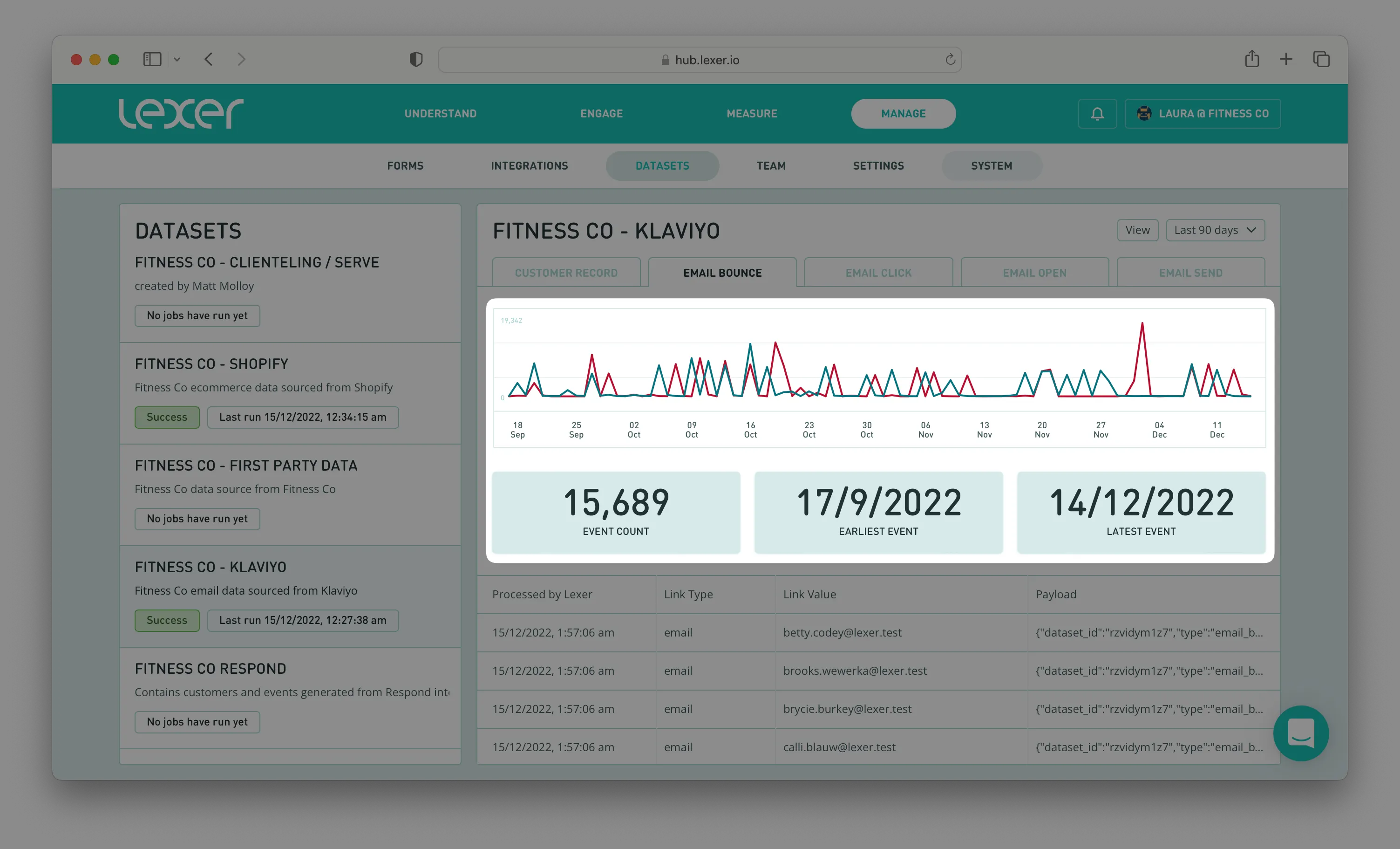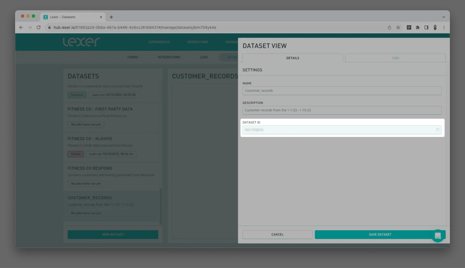 Lexer’s Datasets lets you quickly view and validate the health of your integration feed, including data continuity, volume, and freshness of data flowing into your datasets. Drilling down even further, you can click into each record to view the payload for individual customer records.