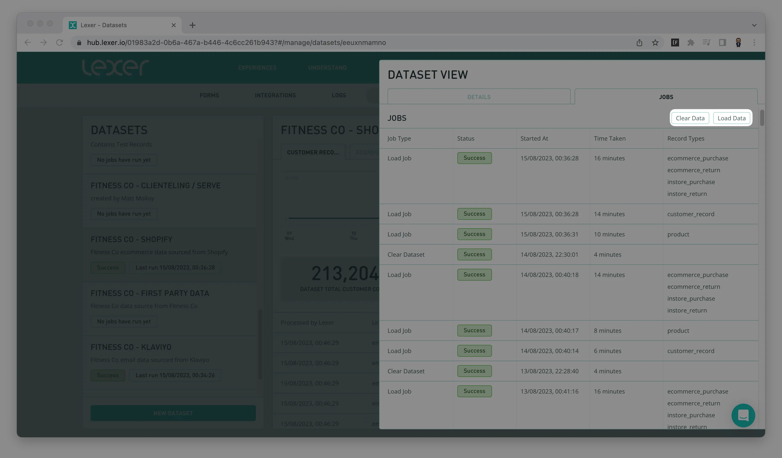 Within the dataset view there are two important buttons in the top right of the page, Clear Data and Load Data.