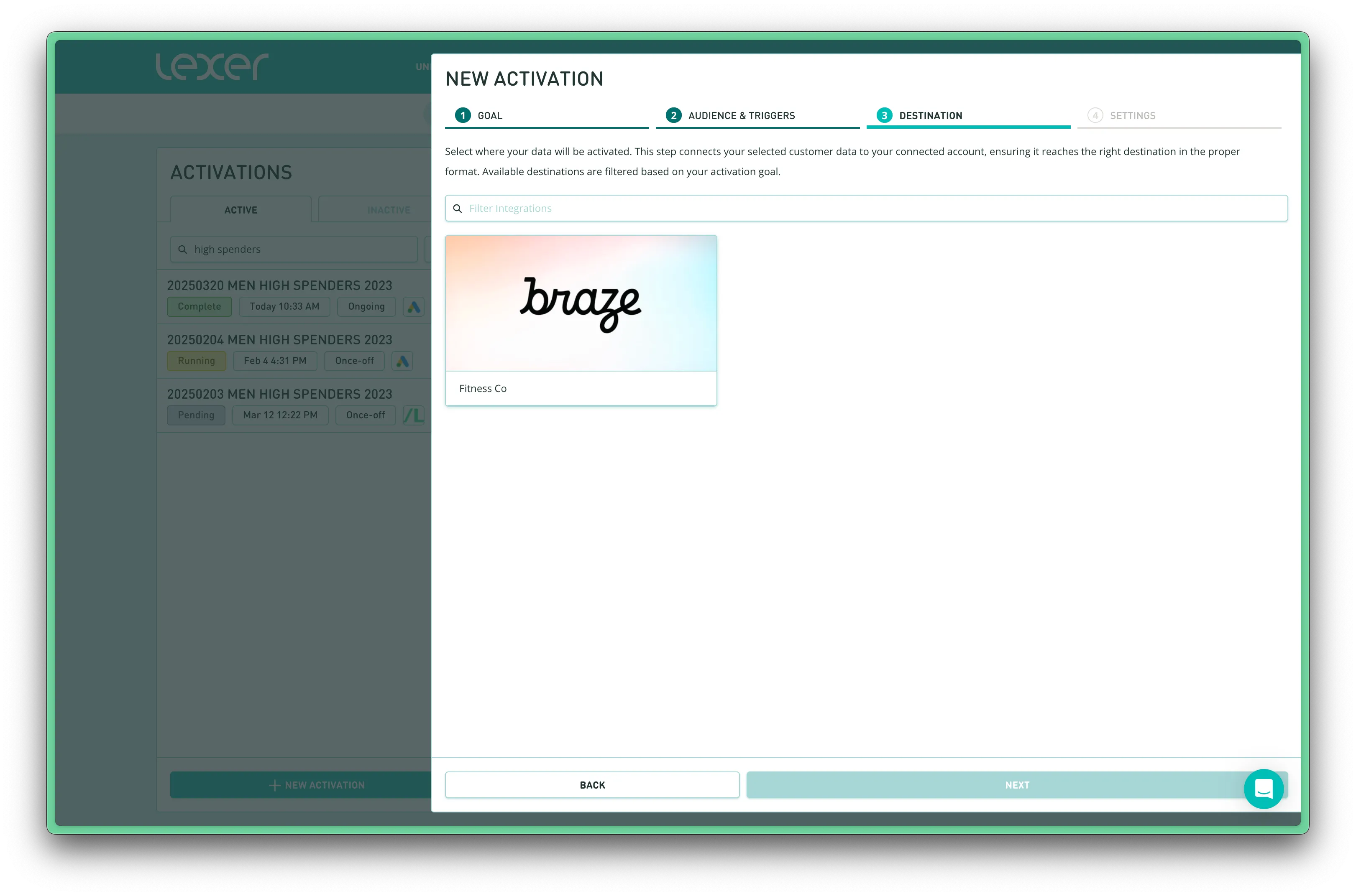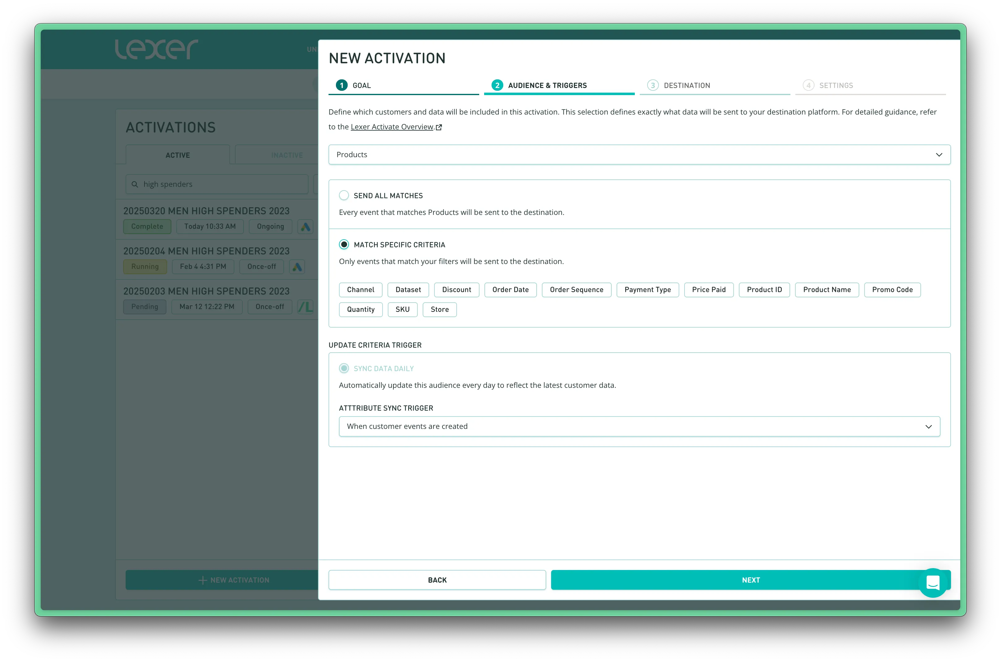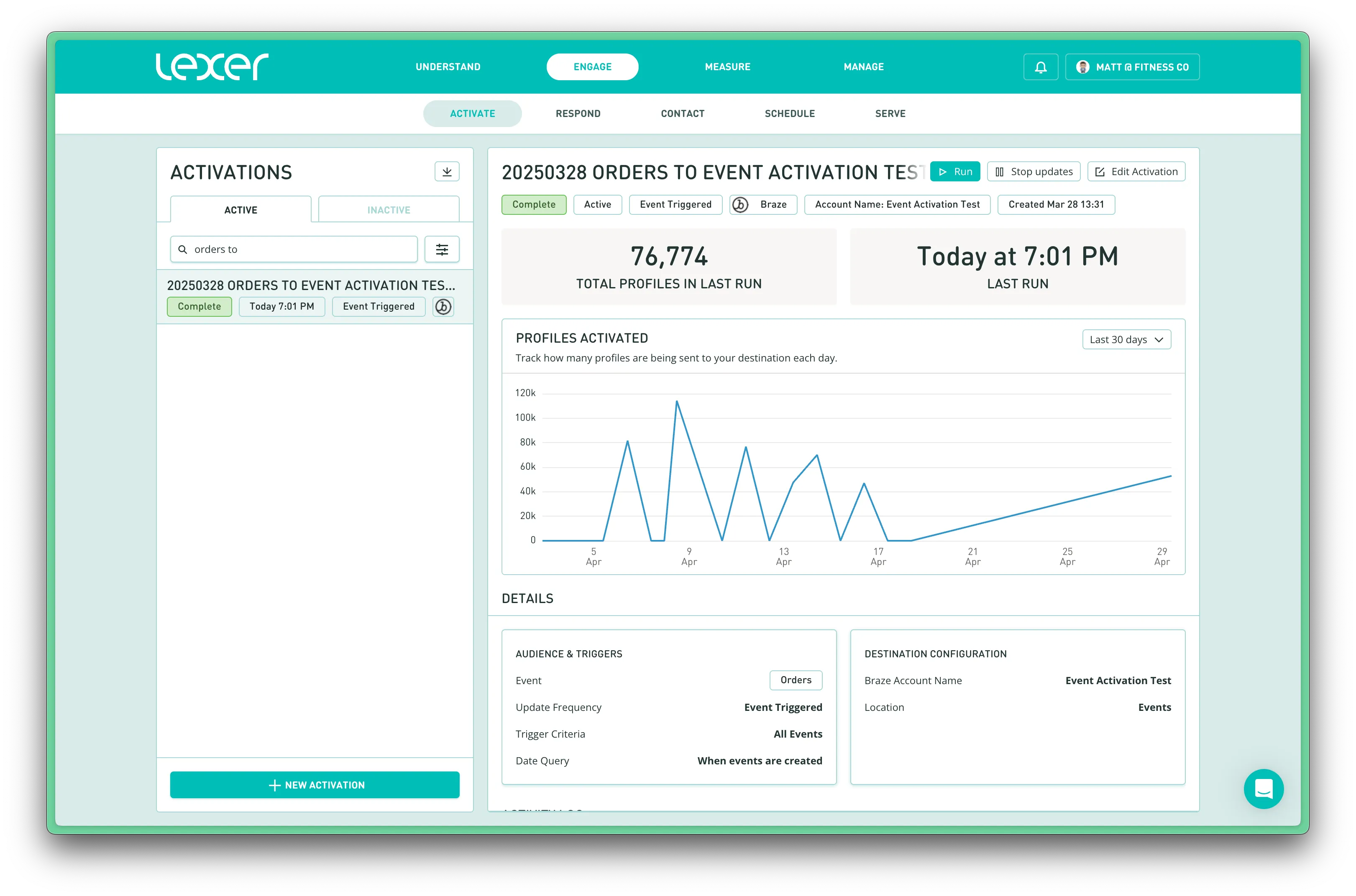 Lexer Activate enables you to connect your customer data to marketing tools for more personalized messaging. Event activations are triggered when specific customer actions—like purchases or visits—are detected in your data. These activations send individual event records to your chosen platform, making it easier to respond to key customer behaviors.