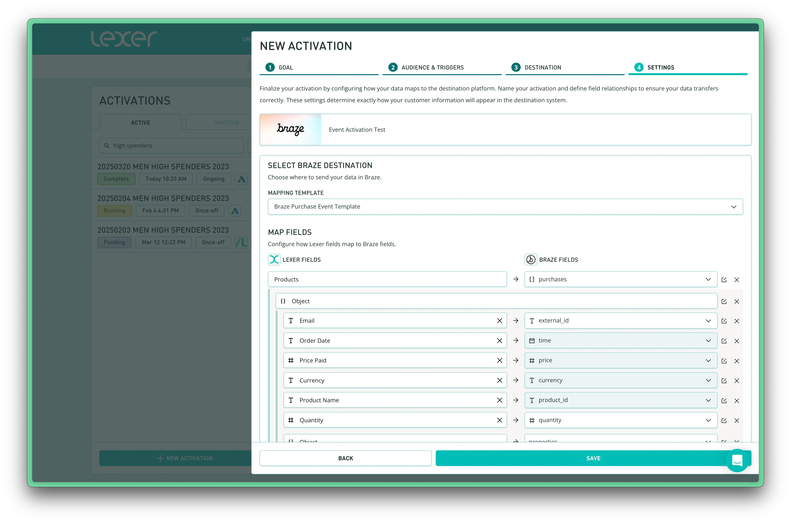Decide which fields in Lexer should be mapped to the corresponding field in Braze. You can select any event or attribute fields in Lexer as your data source.