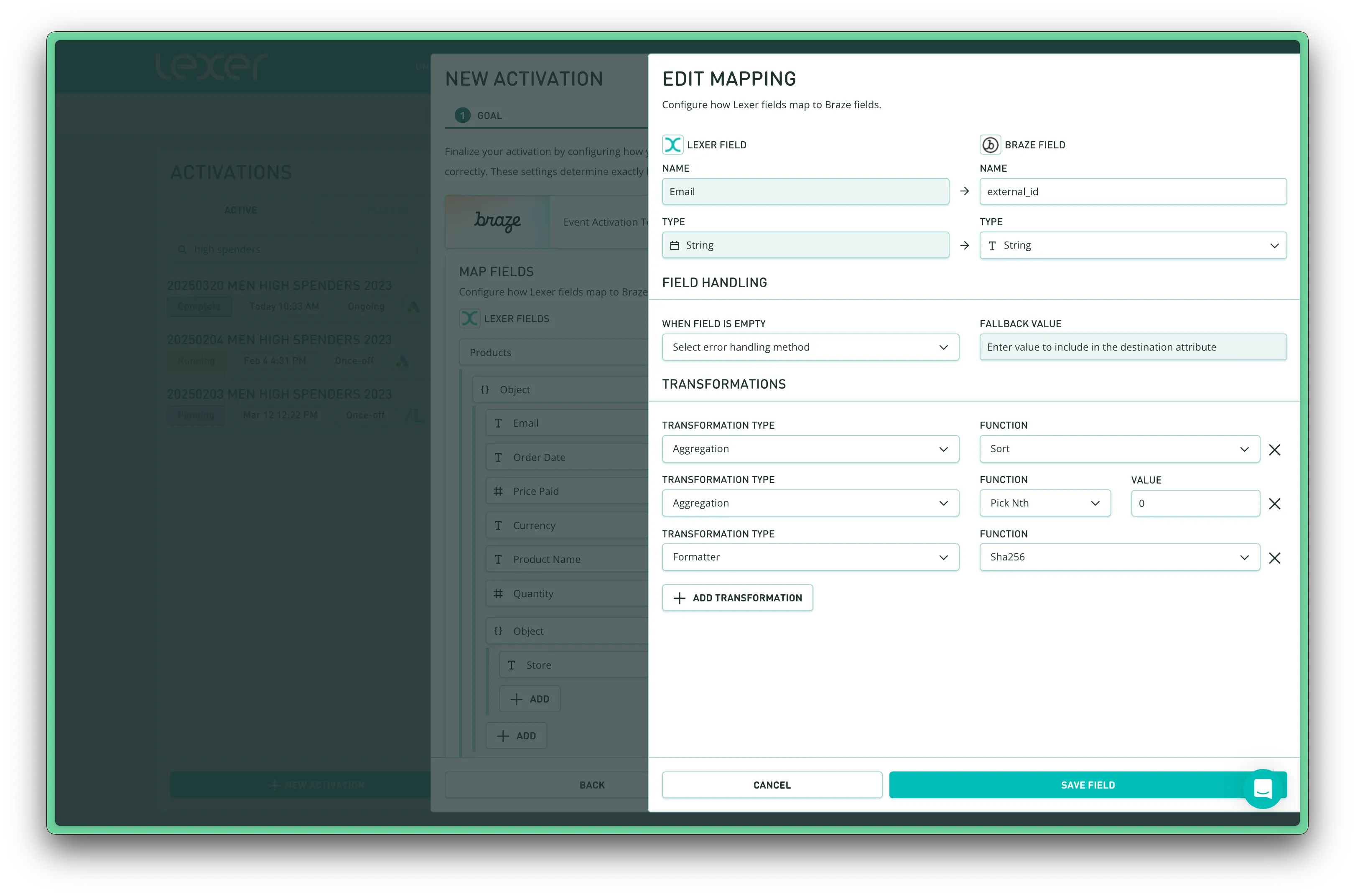 Each destination field can have unique field handling and transformation rules as data is sent from Lexer. Learn more about field mapping options here.