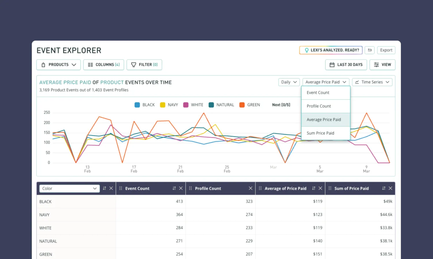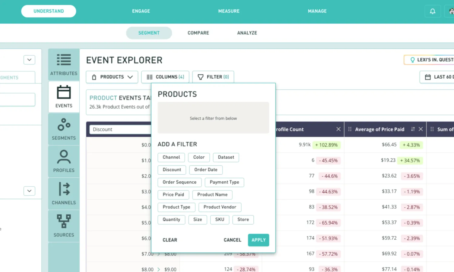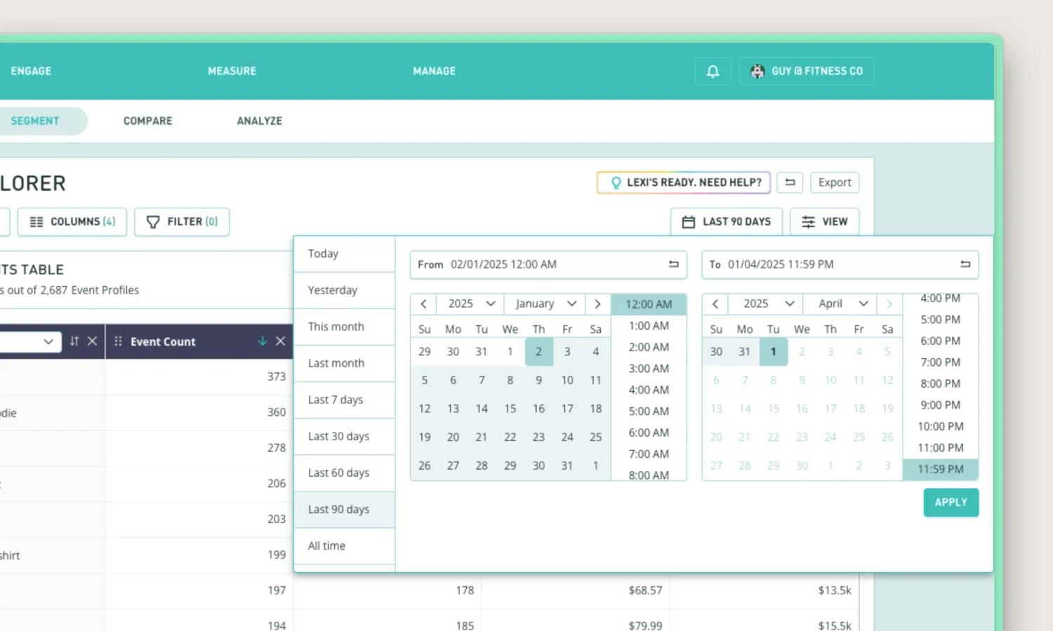 Event Explorer is integrated into Lexer's Segment interface, making it easy to analyze event data in the context of your customer segments.
