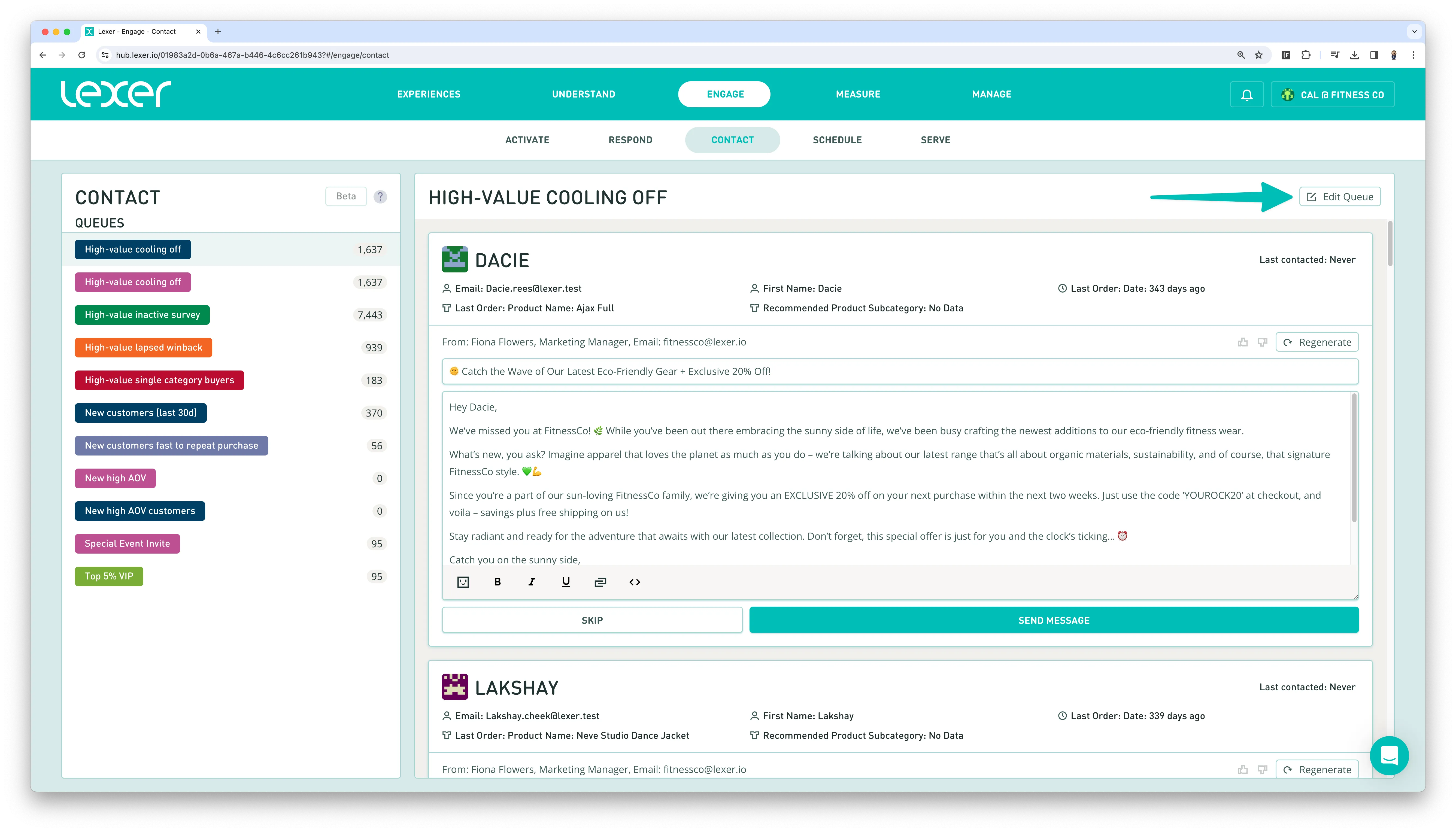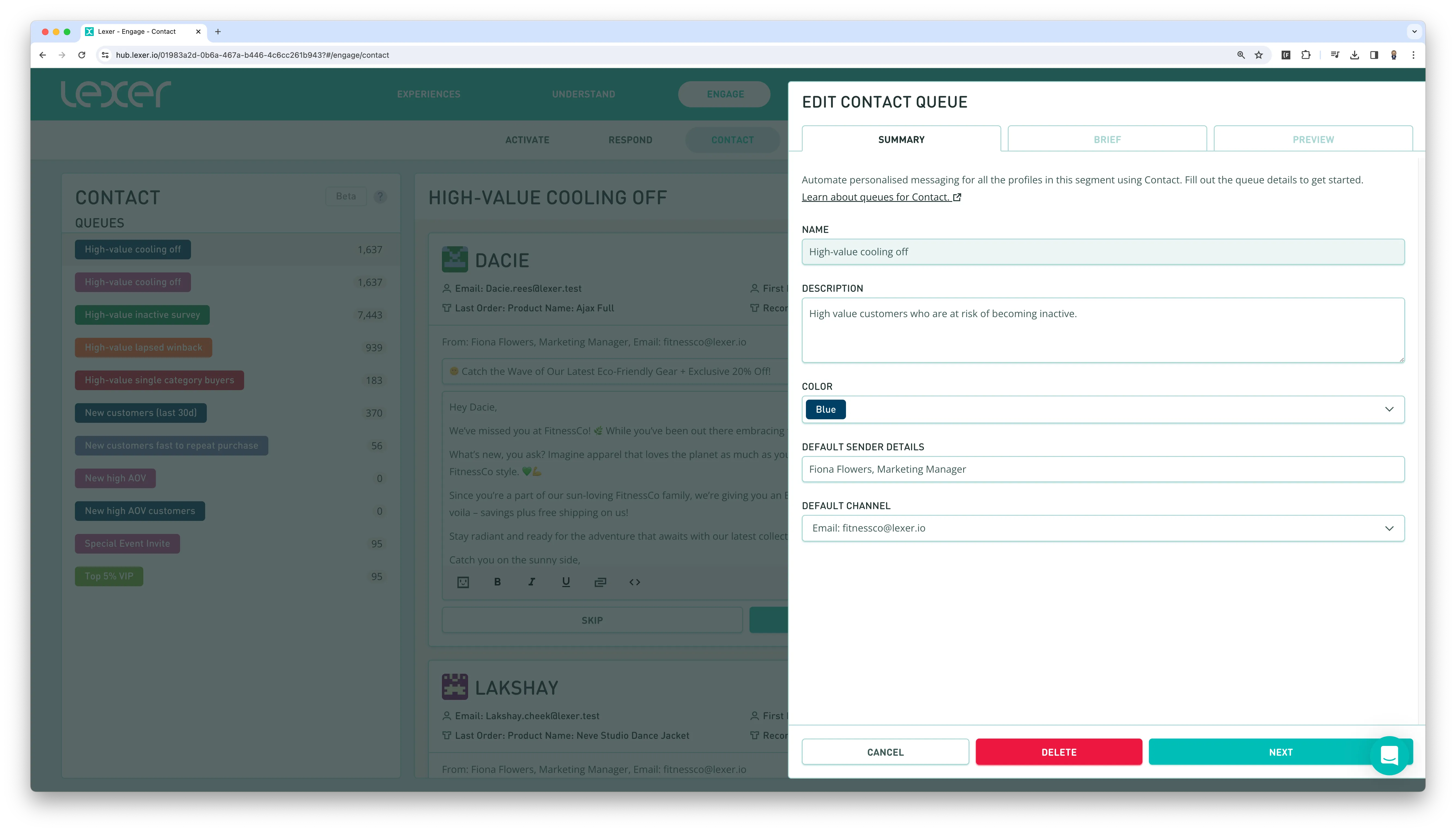 Contact allows you to quickly, and easily send truly personalized messages to customers using Lexi AI! Each message is crafted for the customer, with the knowledge of the whole CDXP to personalize the message. Lexi will also incorporate your brand values, tone, and your role in the business. These messages are not only tailored for the customer but also customized to align with your role, ensuring they are sent from the right team member during those critical windows of opportunity that lead to conversions. It's truly a game changer for one-to-one customer outreach allowing you to drastically improve engagement in a way that was extremely challenging and costly to scale before now.