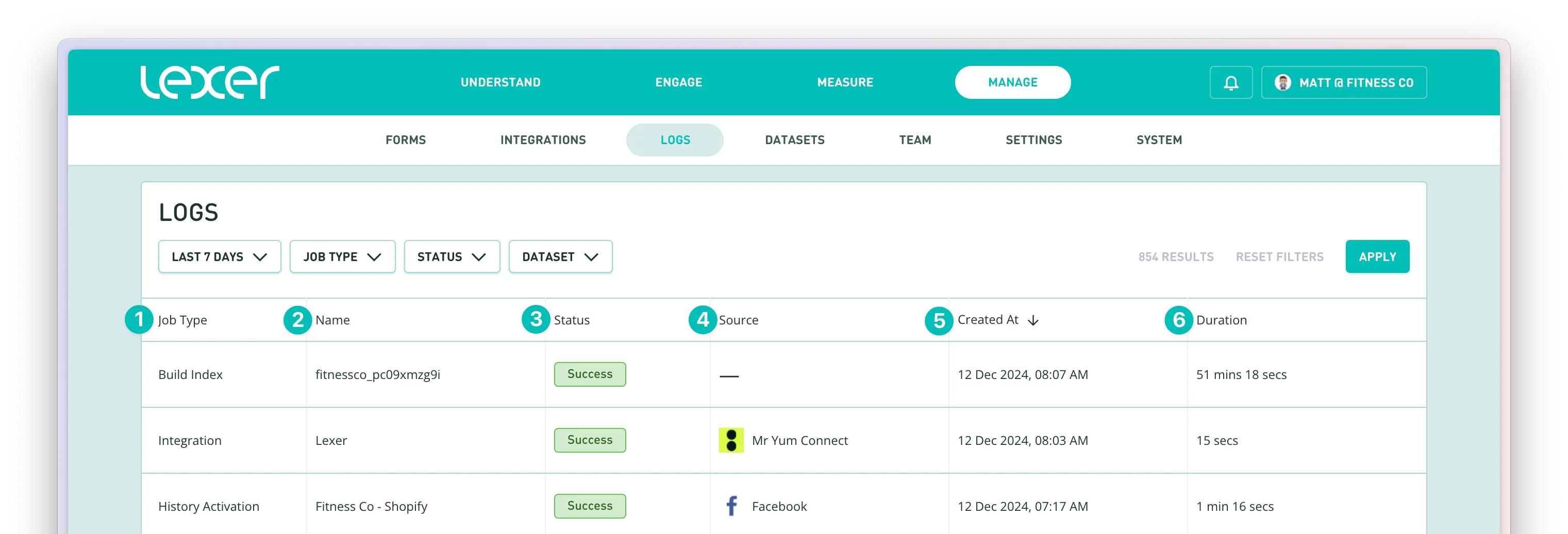 Lexer's Logs feature gives you complete visibility into how your customer data flows through the CDP. Whether you're monitoring routine data imports or troubleshooting specific issues, Logs provides a clear timeline of every data job - from initial file uploads through to final processing. You can quickly verify successful data loads, identify potential issues, and ensure your customer data is being processed correctly. This guide will show you how to use Logs effectively to monitor and maintain the health of your customer data.