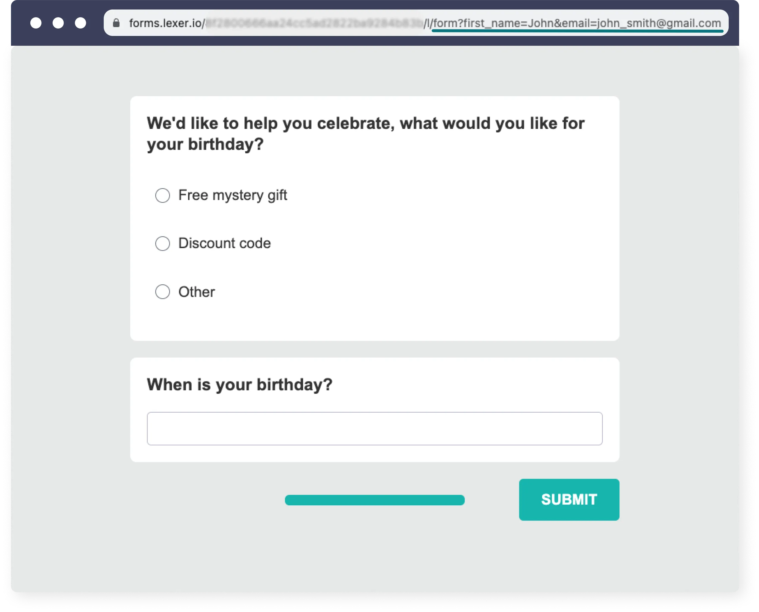 For example: If you're sending your Lexer Form via Mailchimp, you can use Mailchimp merge tags to insert subscriber-specific values into your form URL.