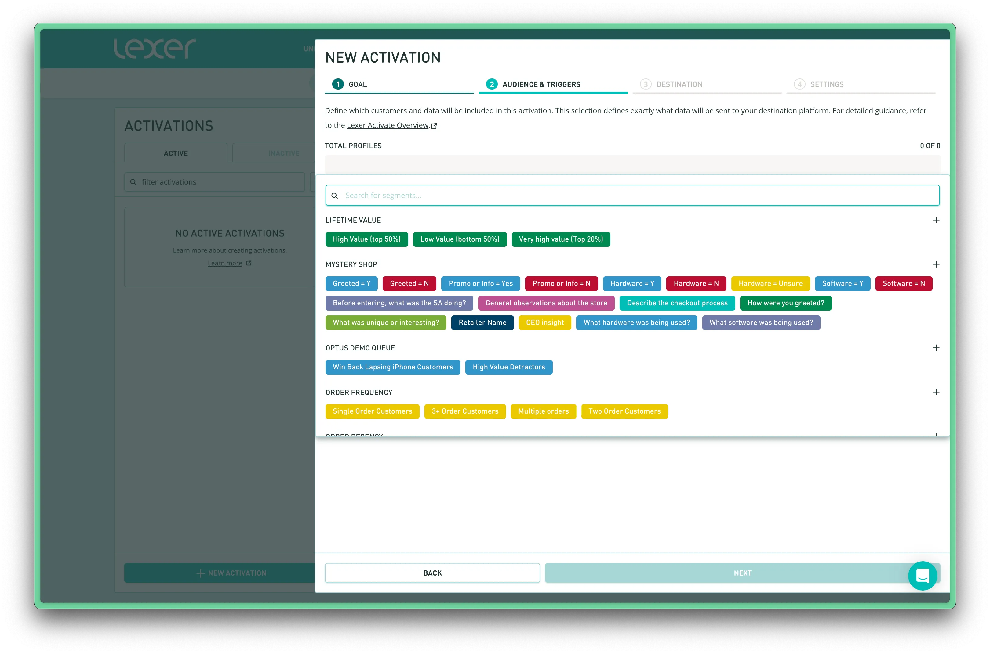 Select one or more segments to define as your audience. Adding a segment will show the total number of estimated profiles that can be sent via the activation.