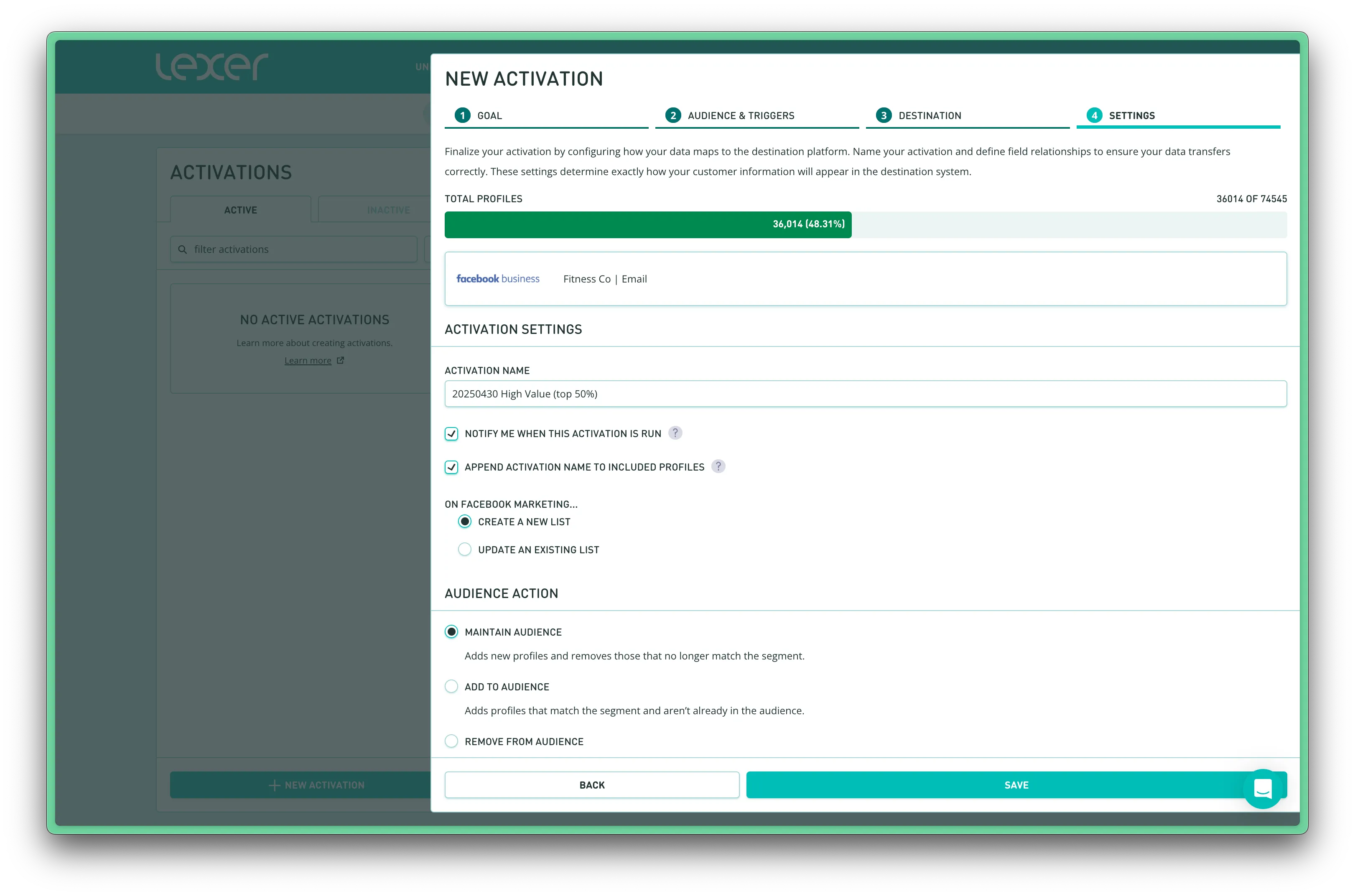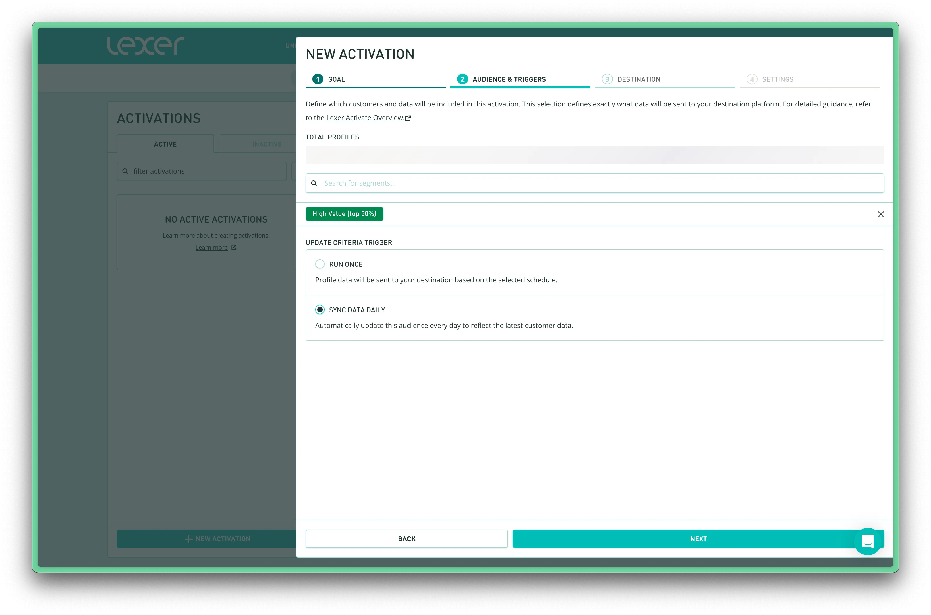 When configuring your activation, ensure you’ve selected the Run daily option. That’s it! Lexer will make sure the audience is always refreshed and up to date with the latest customer data each day.