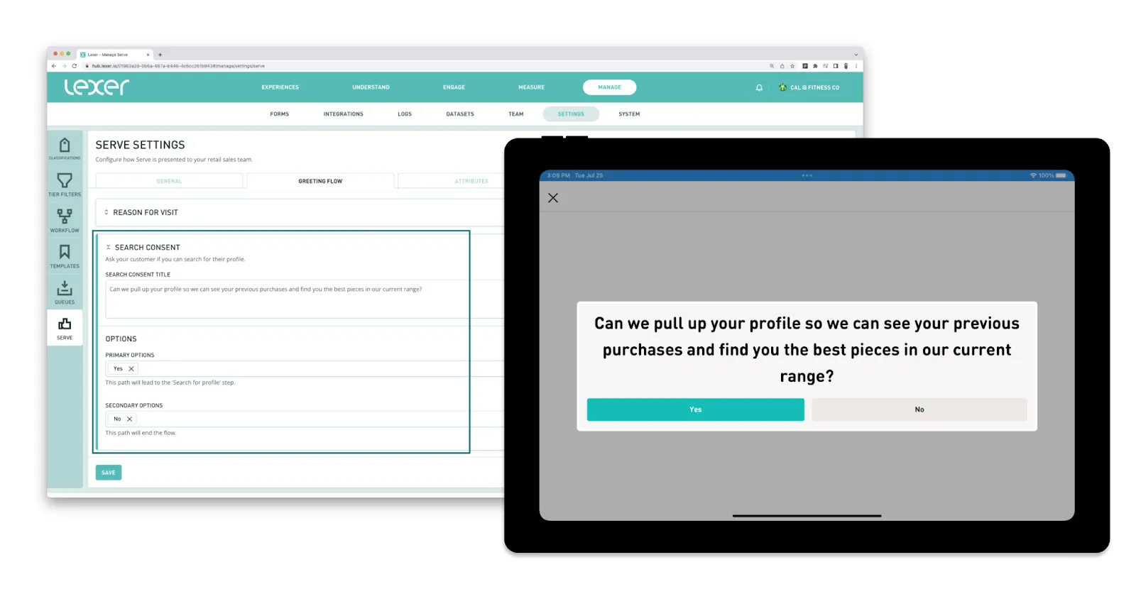 Serve’s Greeting flow tab allows you to configure the questions that are presented when a new customer is checked in. Make sure the questions align with your branding and provide you with the customer data you’d like to capture in store.