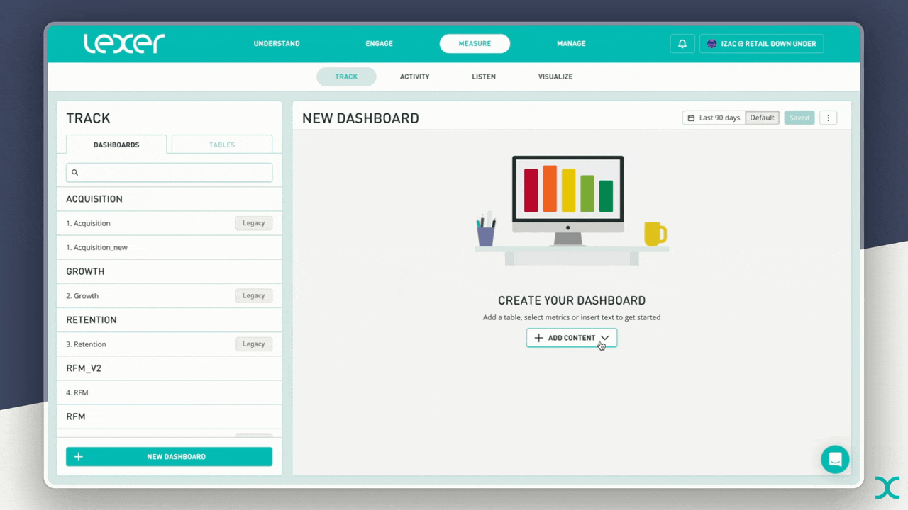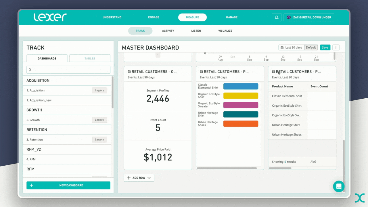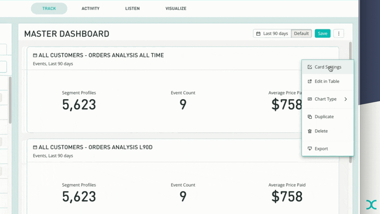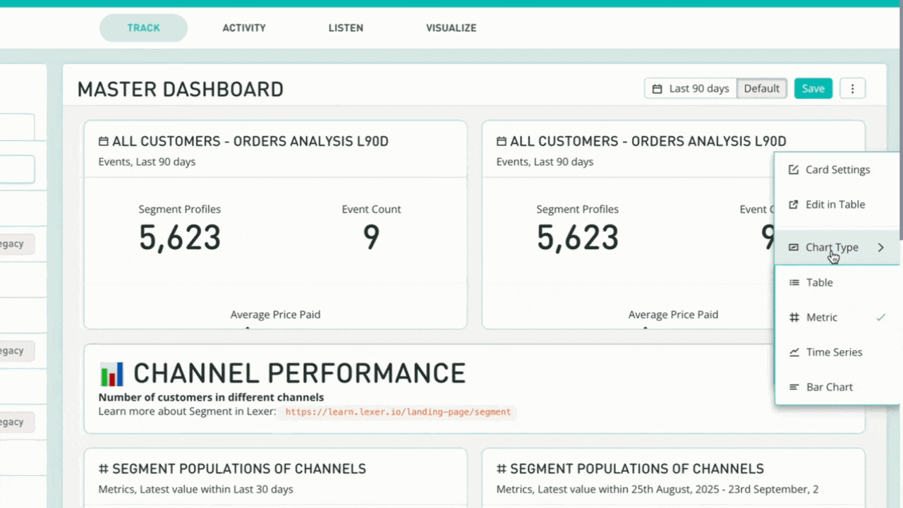Track Dashboards let you to group related customer segments, metrics, and events together to tell a story.