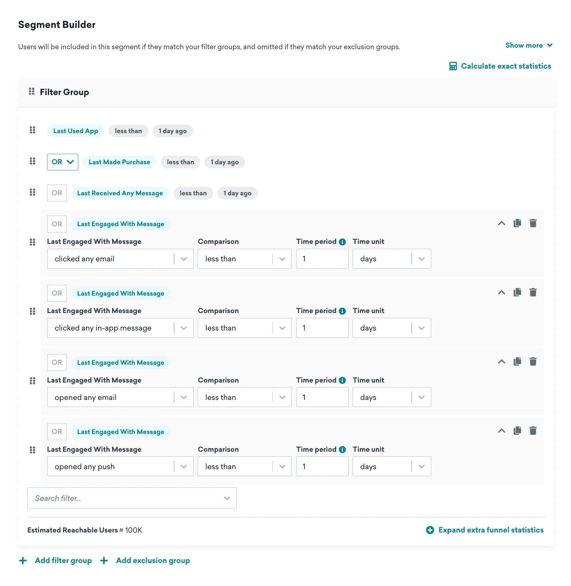 - Segment Builder > Filter Group: Apply the filters demonstrated in the screenshot below