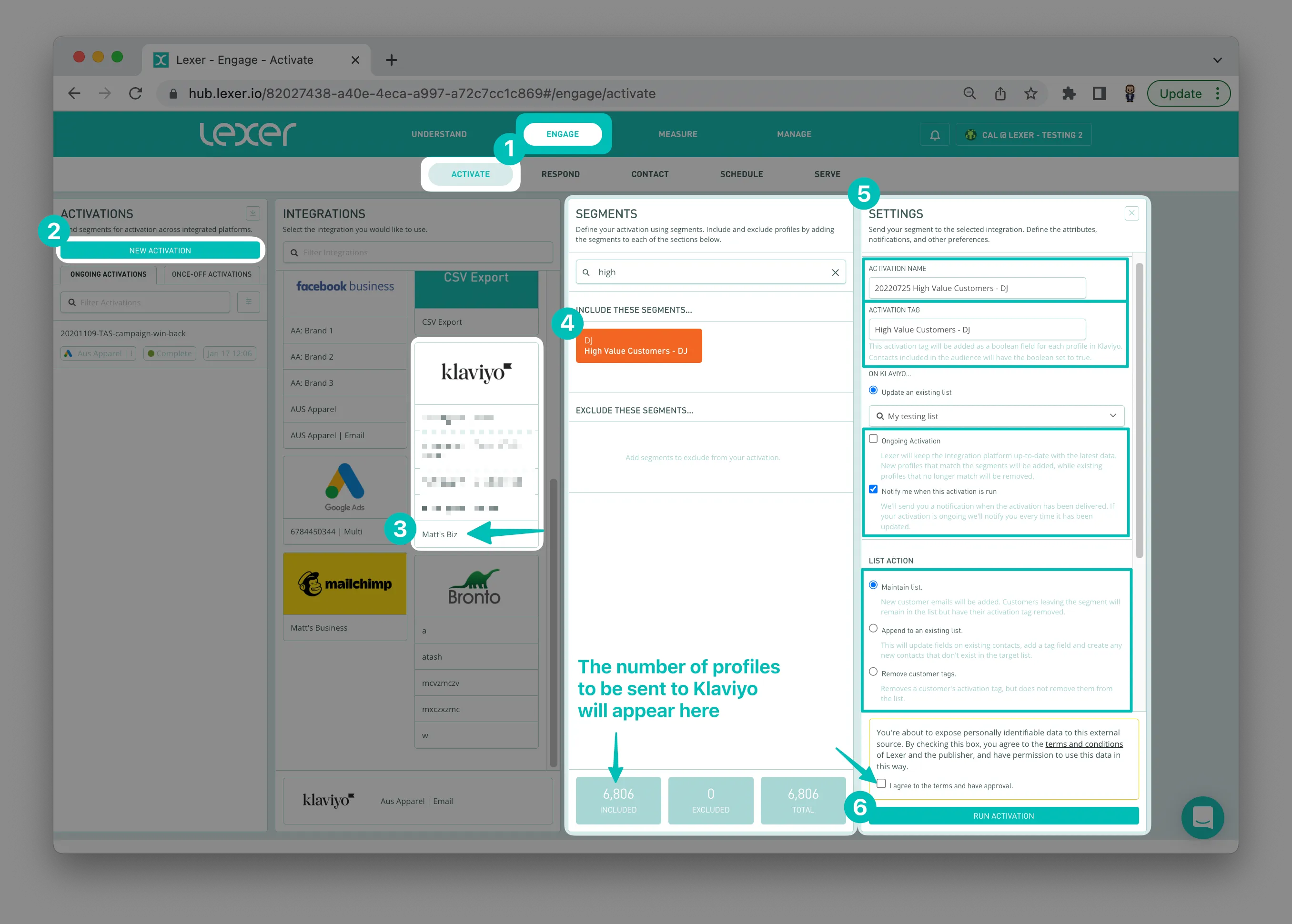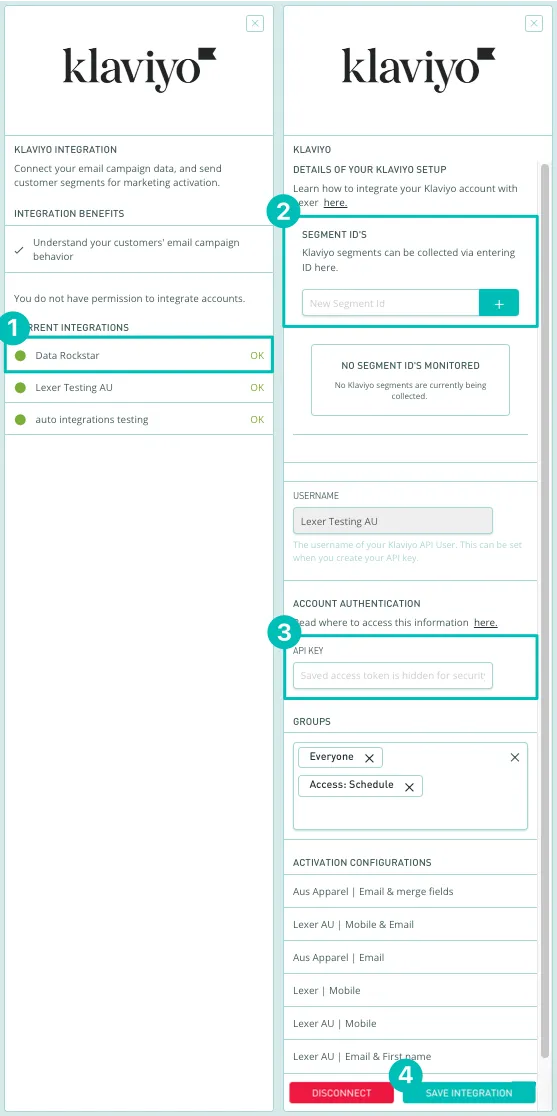 - Created a Klaviyo activation configuration (reach out to Lexer Support (support@lexer.io) if not).