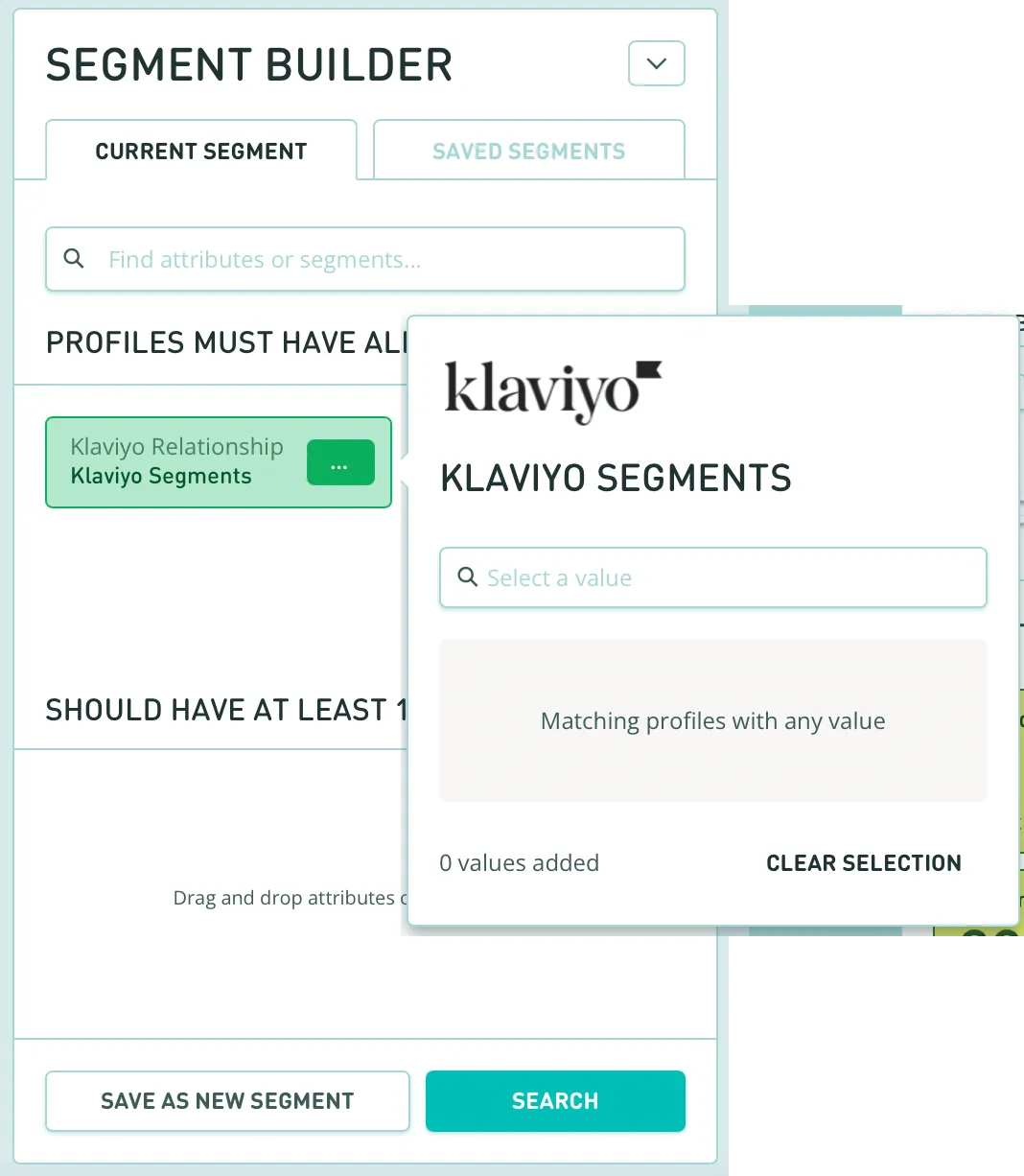 The Klaviyo Segments attribute will display a list of all available synced segments.