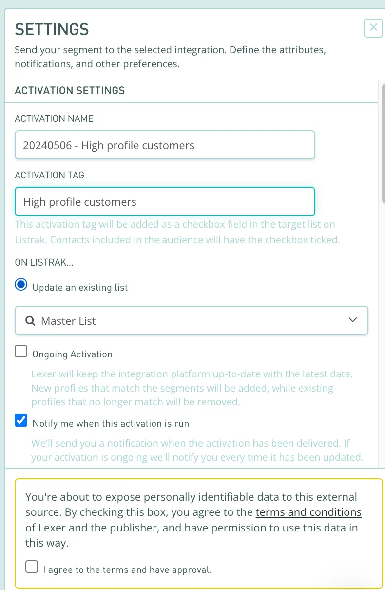 - Depending on the size of the audience within Lexer, the activation will take a few minutes to run; if you've ticked the Notify me when this activation is run option, you will receive an email and in-hub notification that your activation has run.