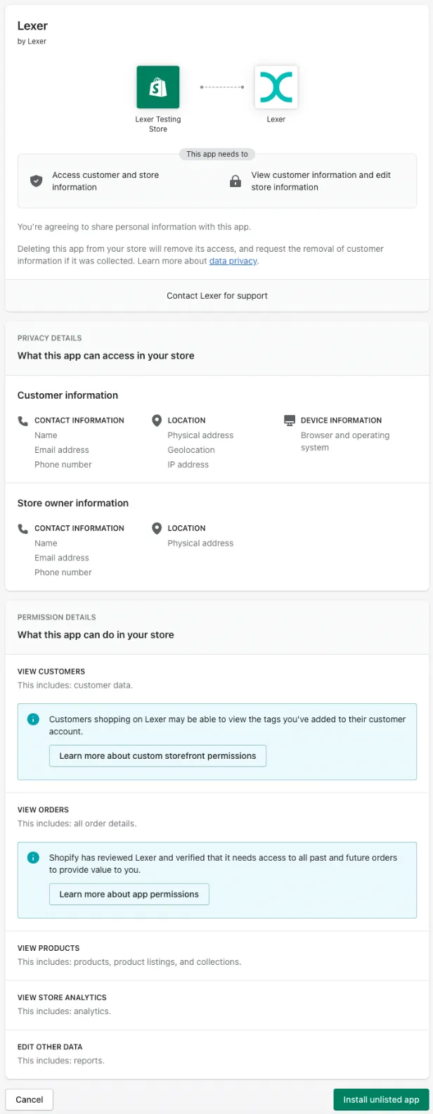 ⬜️ Data out: N/A — Lexer does not send data back into Shopify.