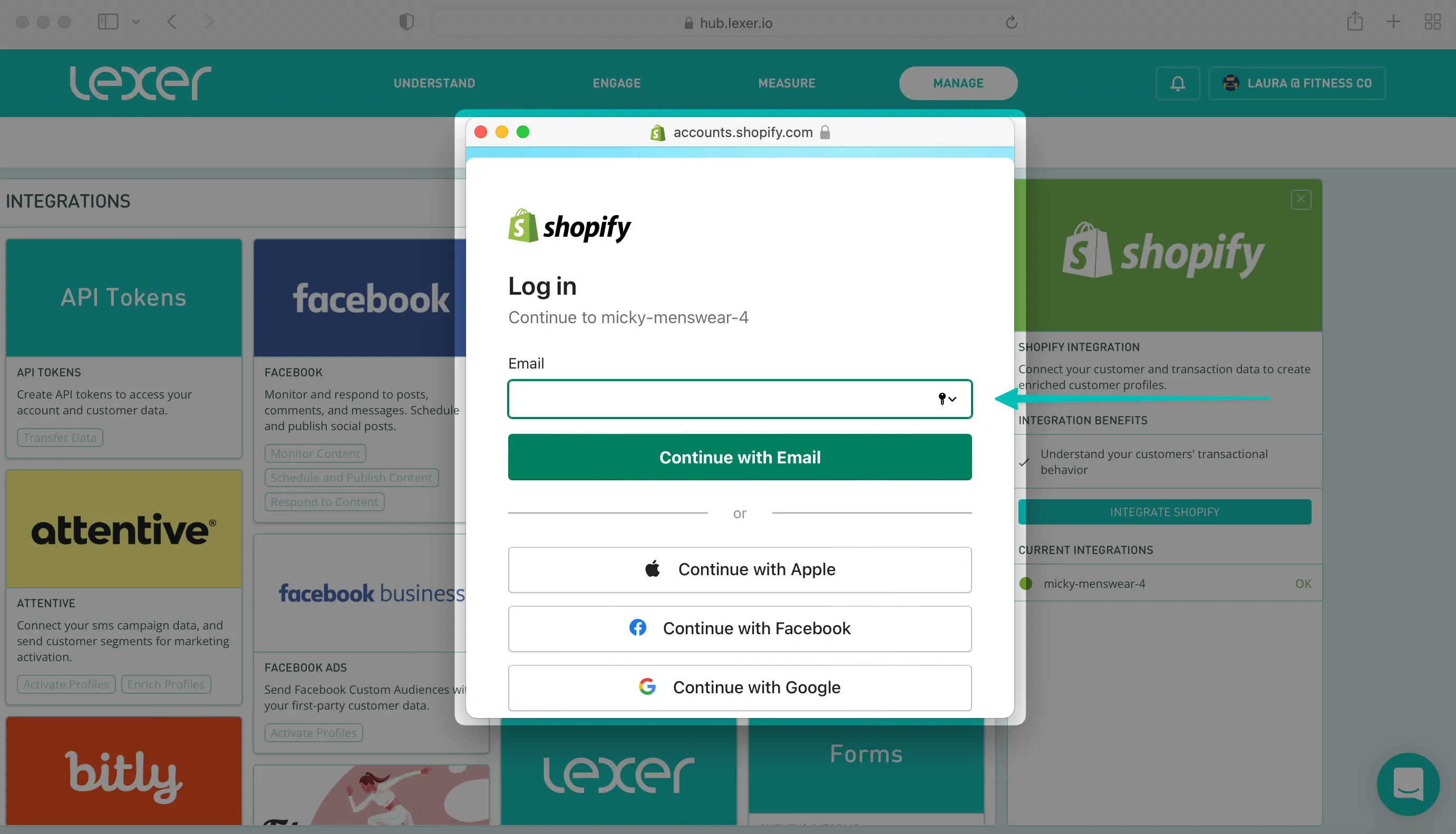 Next, a pop up will appear asking you to enter your Shopify email and password, once you have done so, click Add Integration to save.Connecting your Shopify account with Lexer