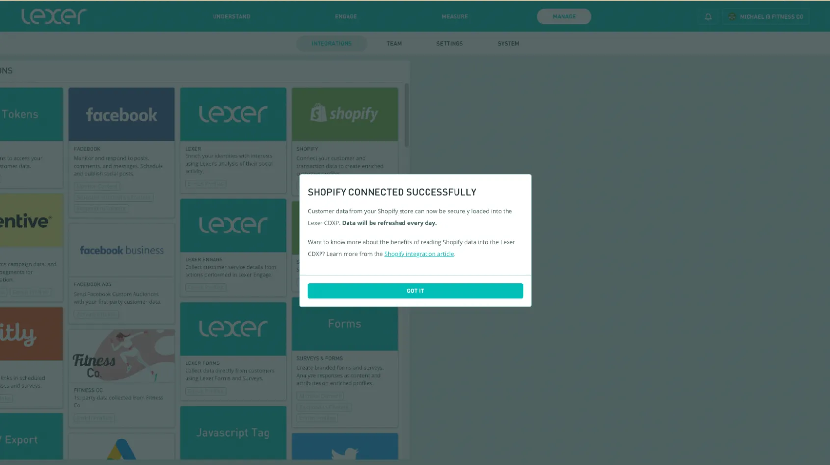 To integrate your Shopify account with Lexer through the hub, navigate to Manage > Integrations in the top navigation bar.