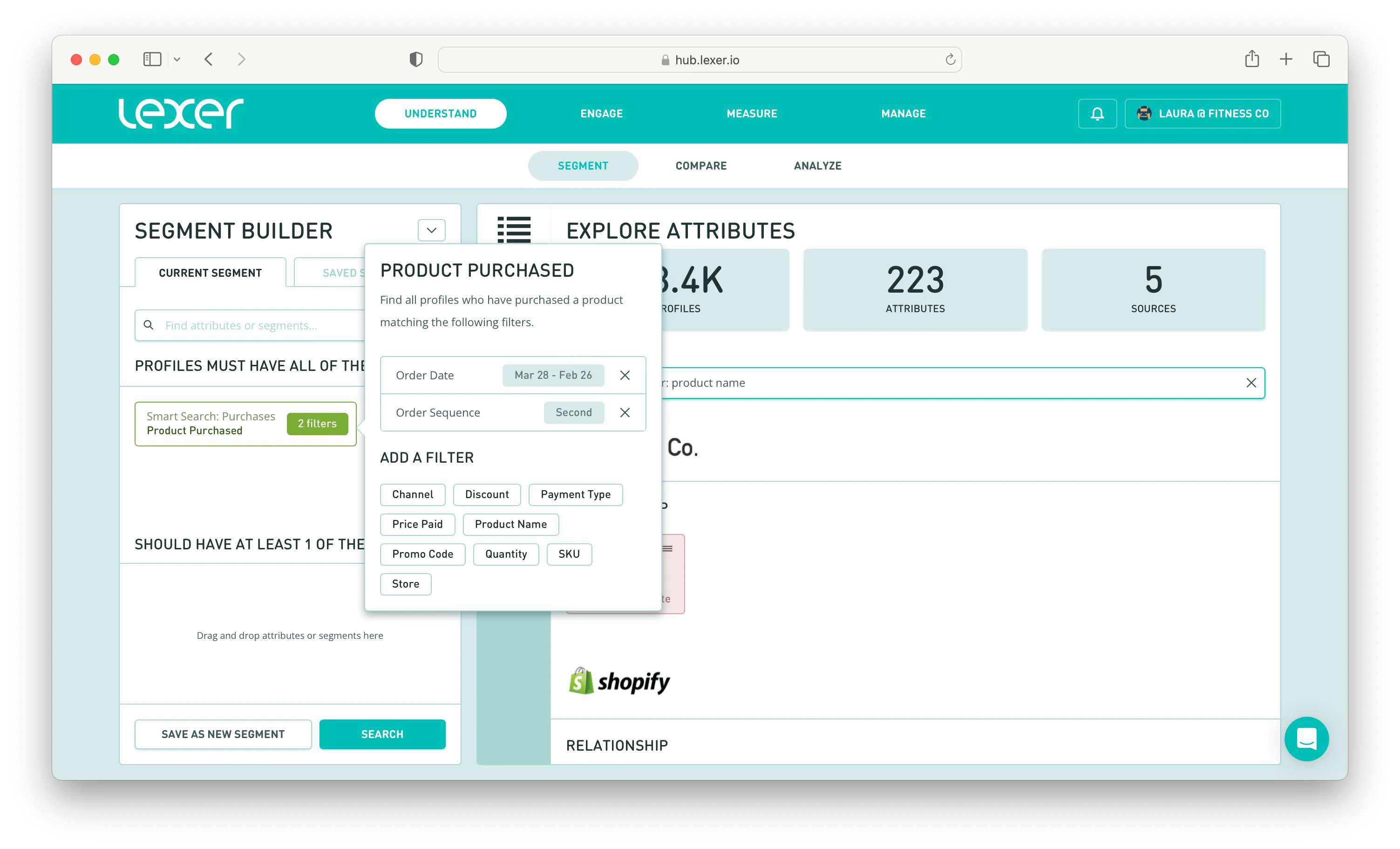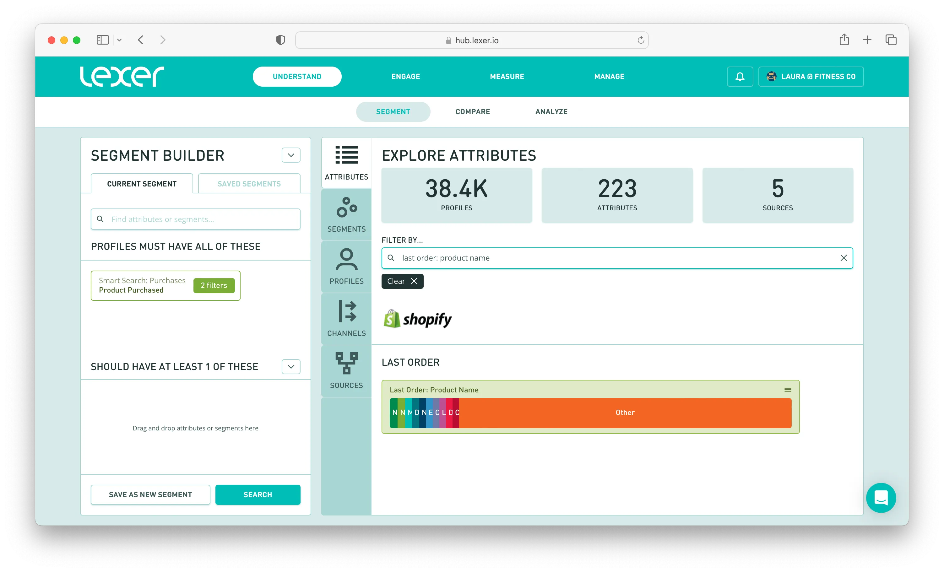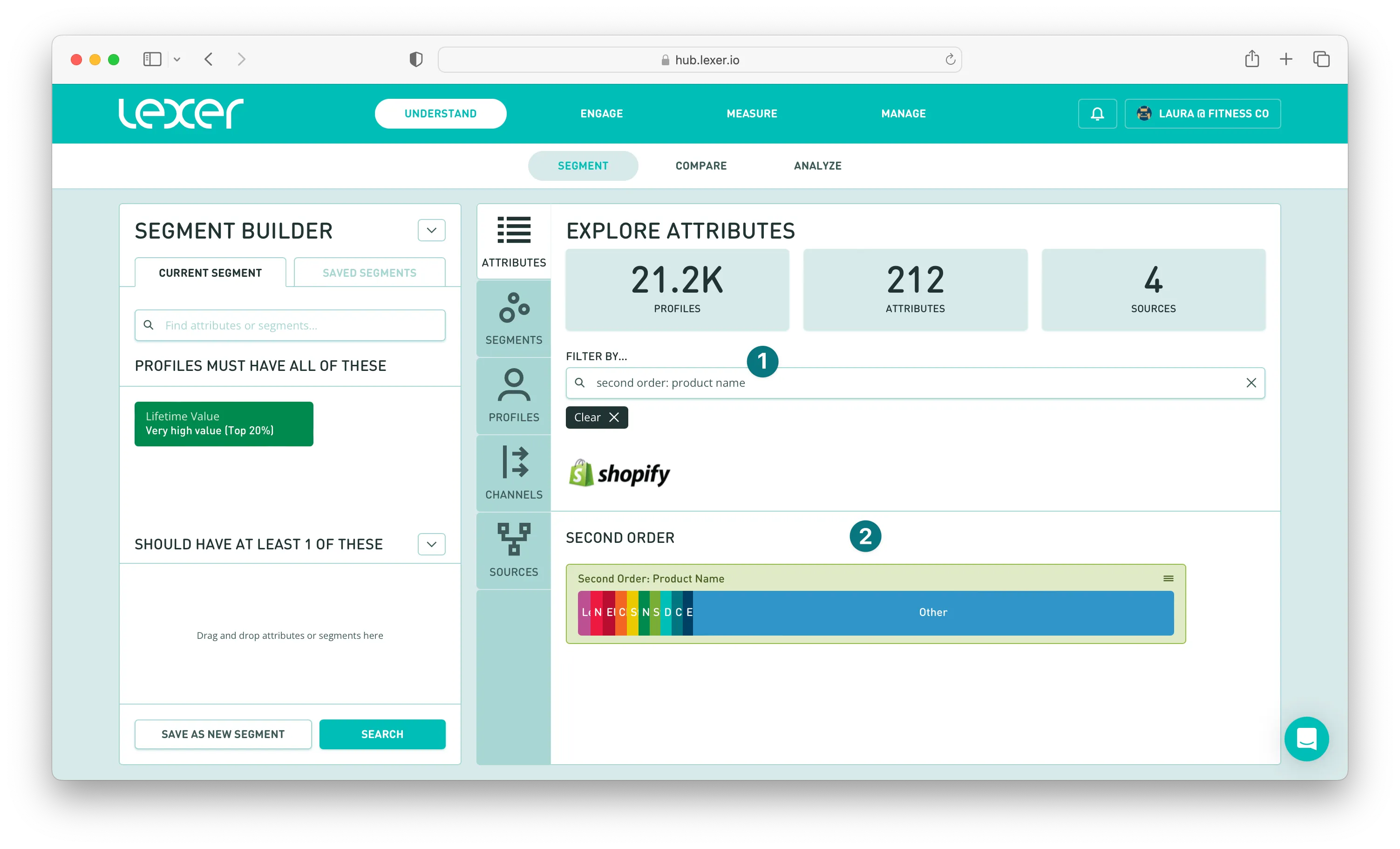 Move to the right of the Segment Builder, and under EXPLORE ATTRIBUTES filter by Second Order: Product Name. Click on this attribute to open up your attribute analysis.