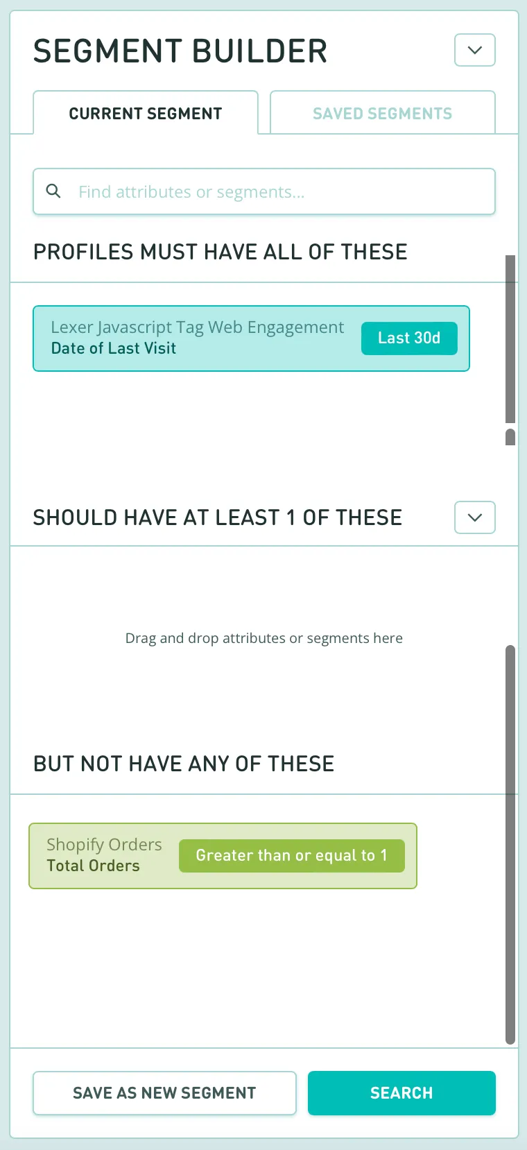 One great little tip is that you can combine the Lexer Javascript Tag segment you built earlier in this article with the email engagement segment you also built, to target prospects who have viewed your website, and subscribed, but are yet to make a purchase.
