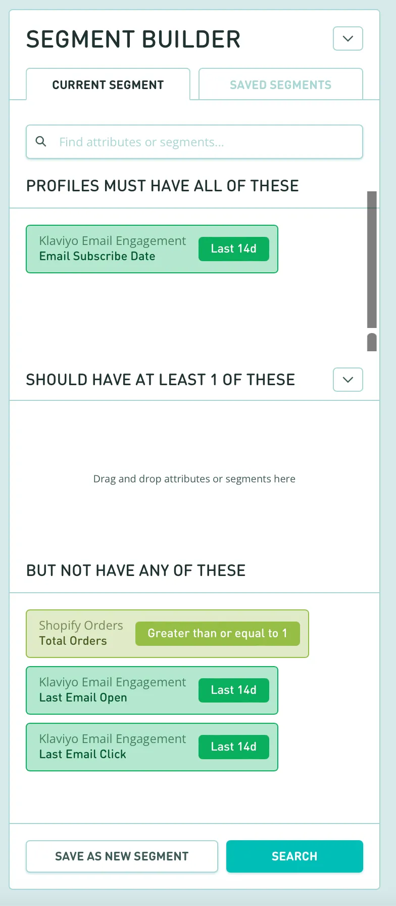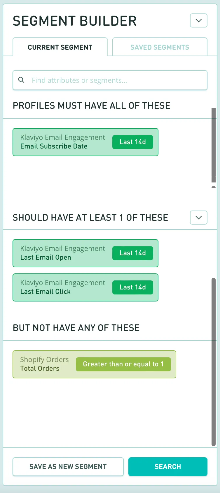 For example, you can identify profiles who have recently subscribed to your emails in the last 14 days, but haven’t made a purchase.