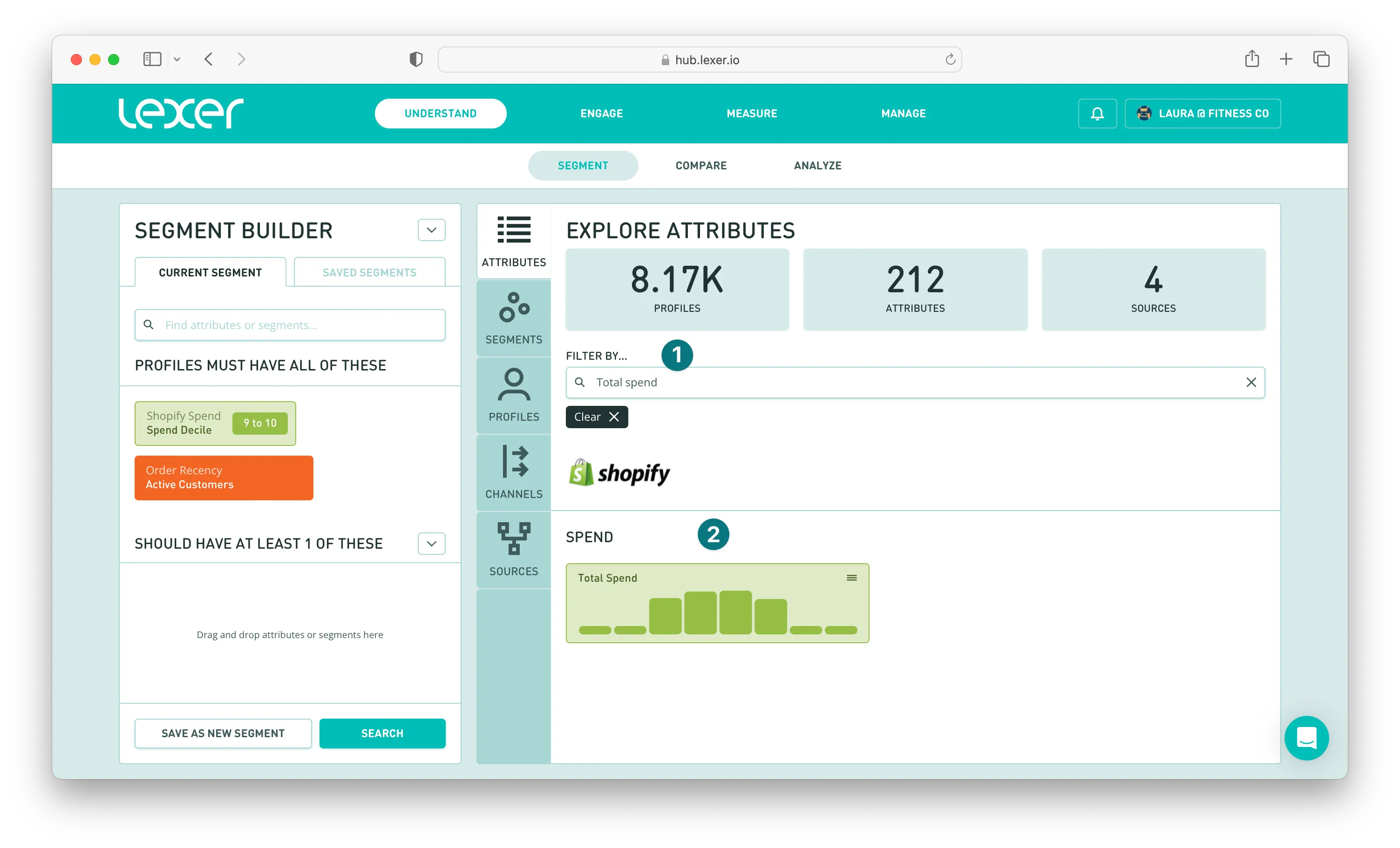 To gain a better understanding of how much revenue these customers have generated for your brand, move to the right of the Segment Builder, and under EXPLORE ATTRIBUTES search for Total Spend.