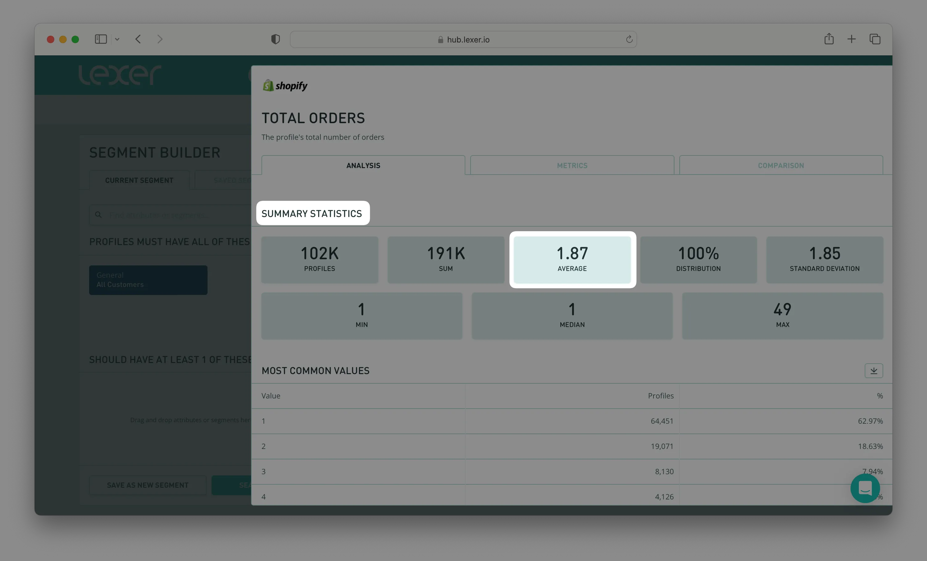 Click into this attribute and scroll down to Summary Statistics. Here you’ll see that the average total orders is 1.87.