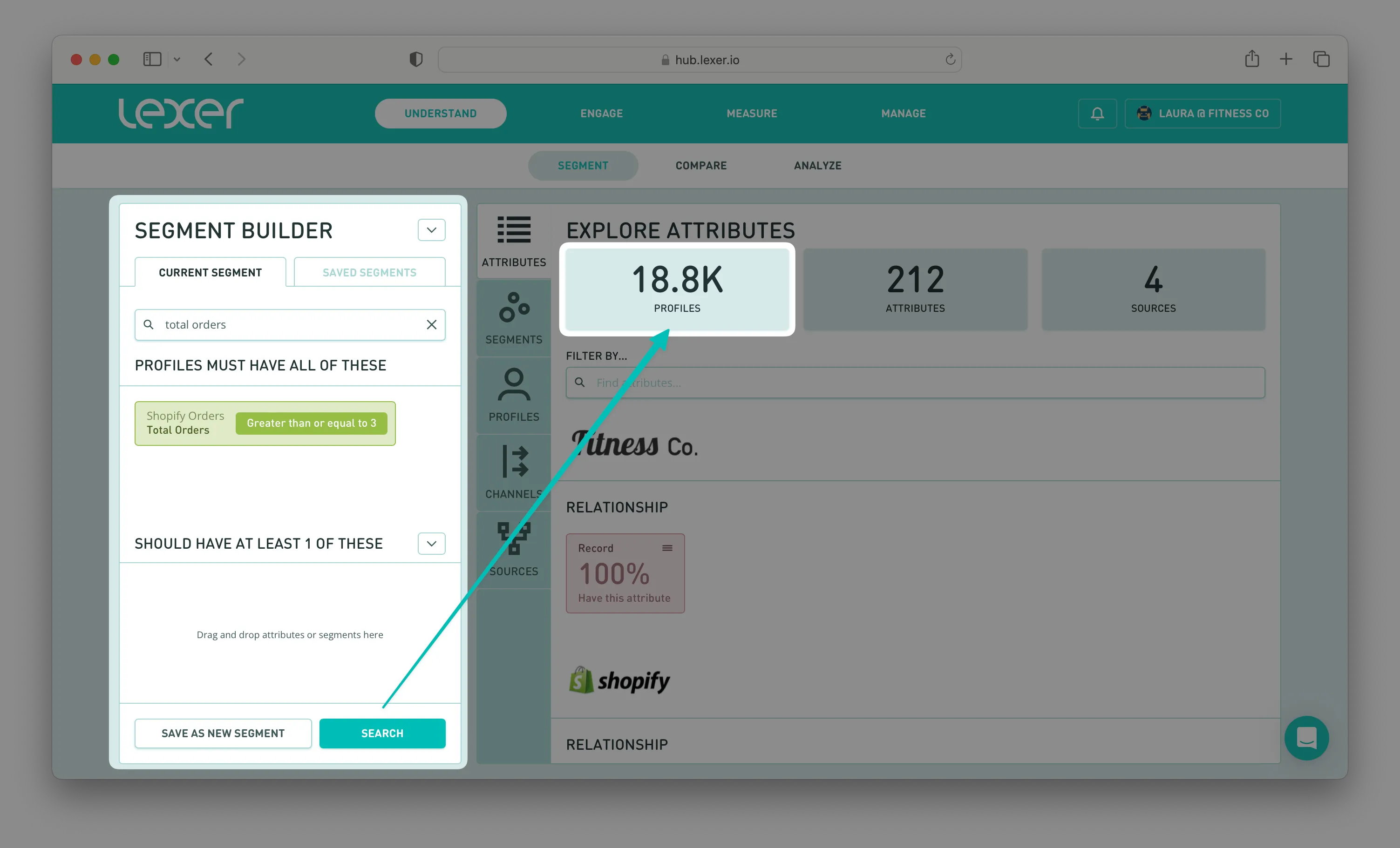 Hit search, and you’ll get the number of profiles with 3 or more orders. In this case it’s 18.8K of your customers, and now you have a loyalty segment you can target for special offers and discounts to encourage more future purchases.
