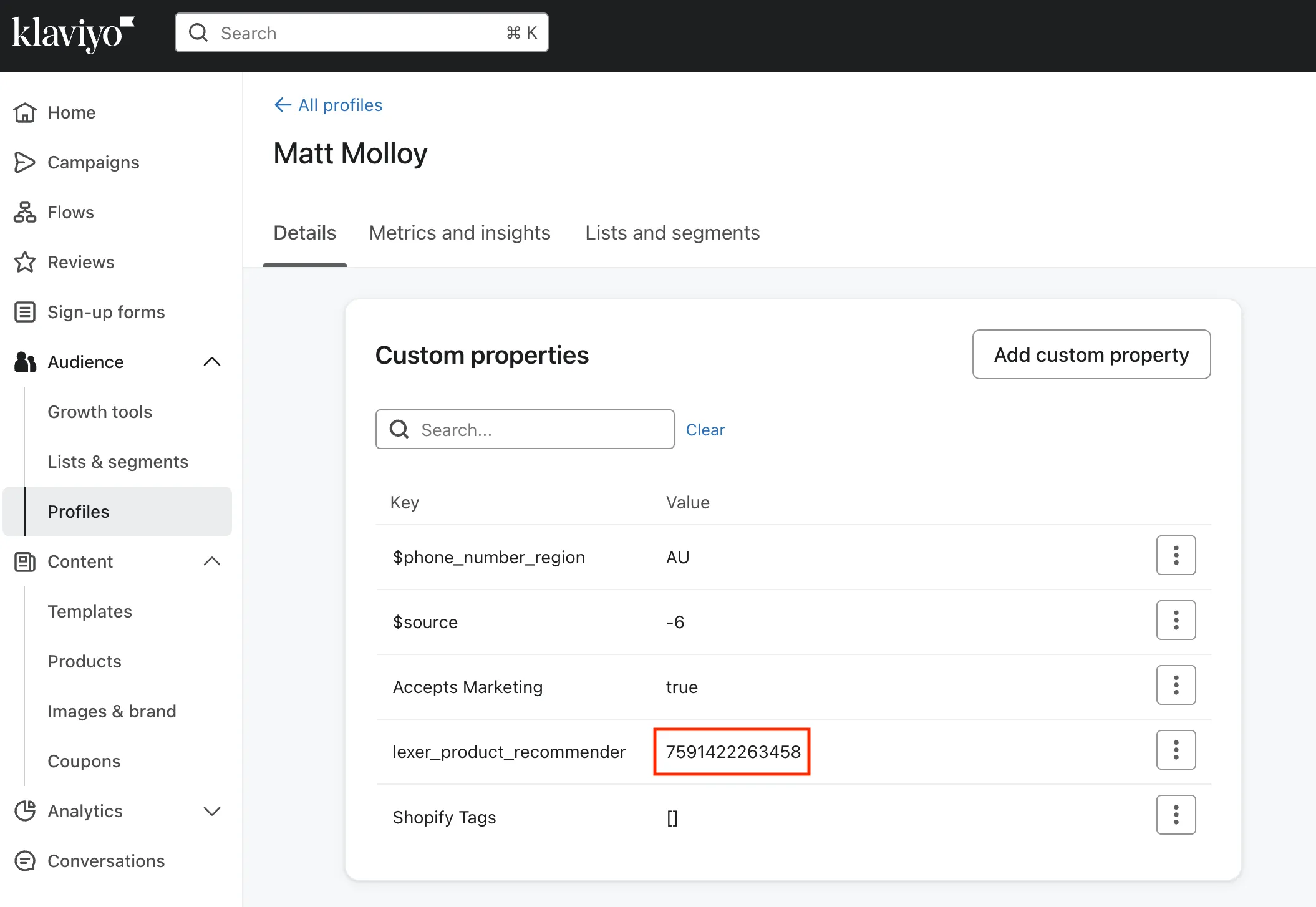 Once the activation has run, you should see this custom property appearing on profiles in Klaviyo.