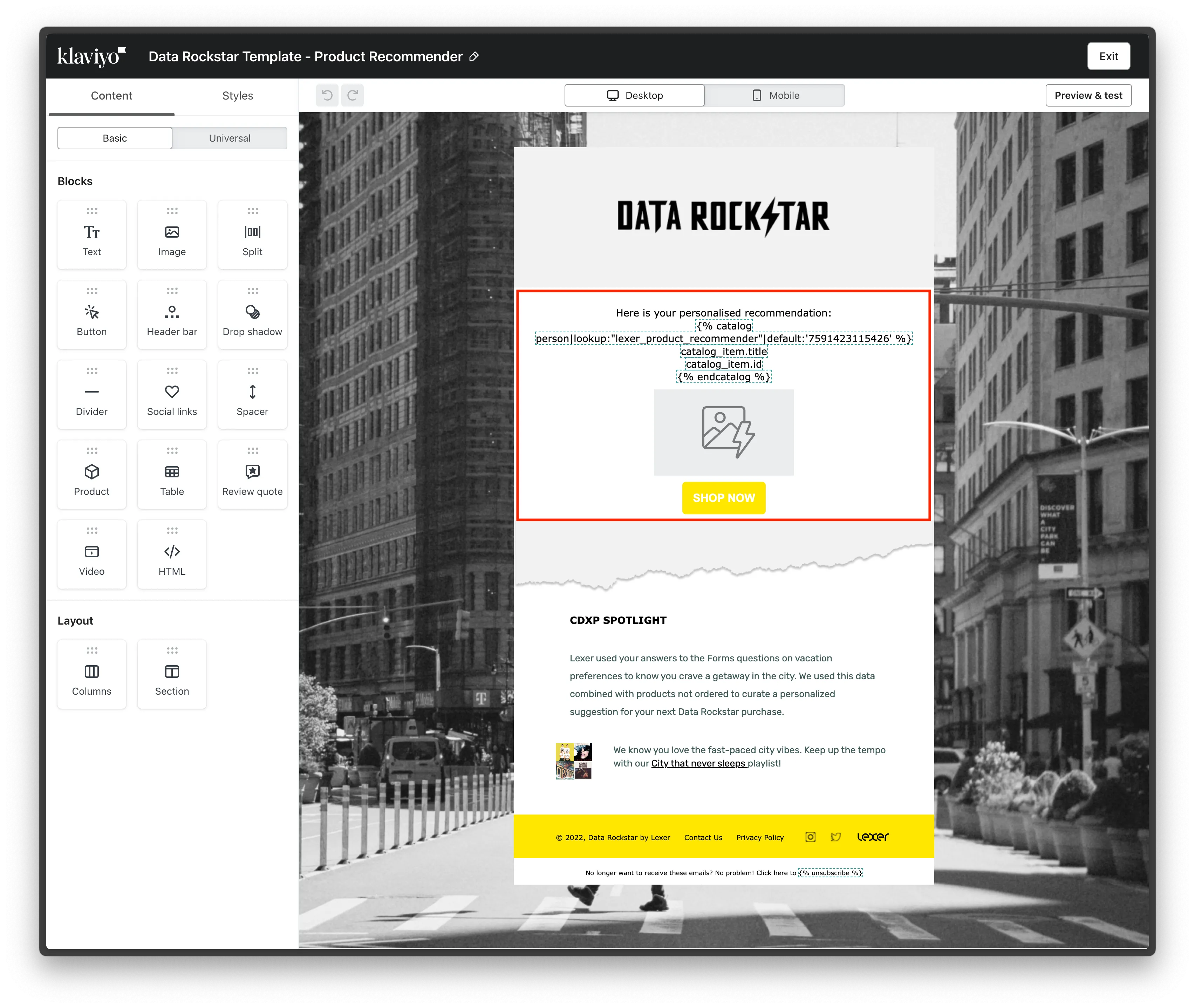 Now you can preview this for any customer in Klaviyo. Click Preview & test in the top right corner, and you can Search for a profile to see how their recommended product will appear in the email.