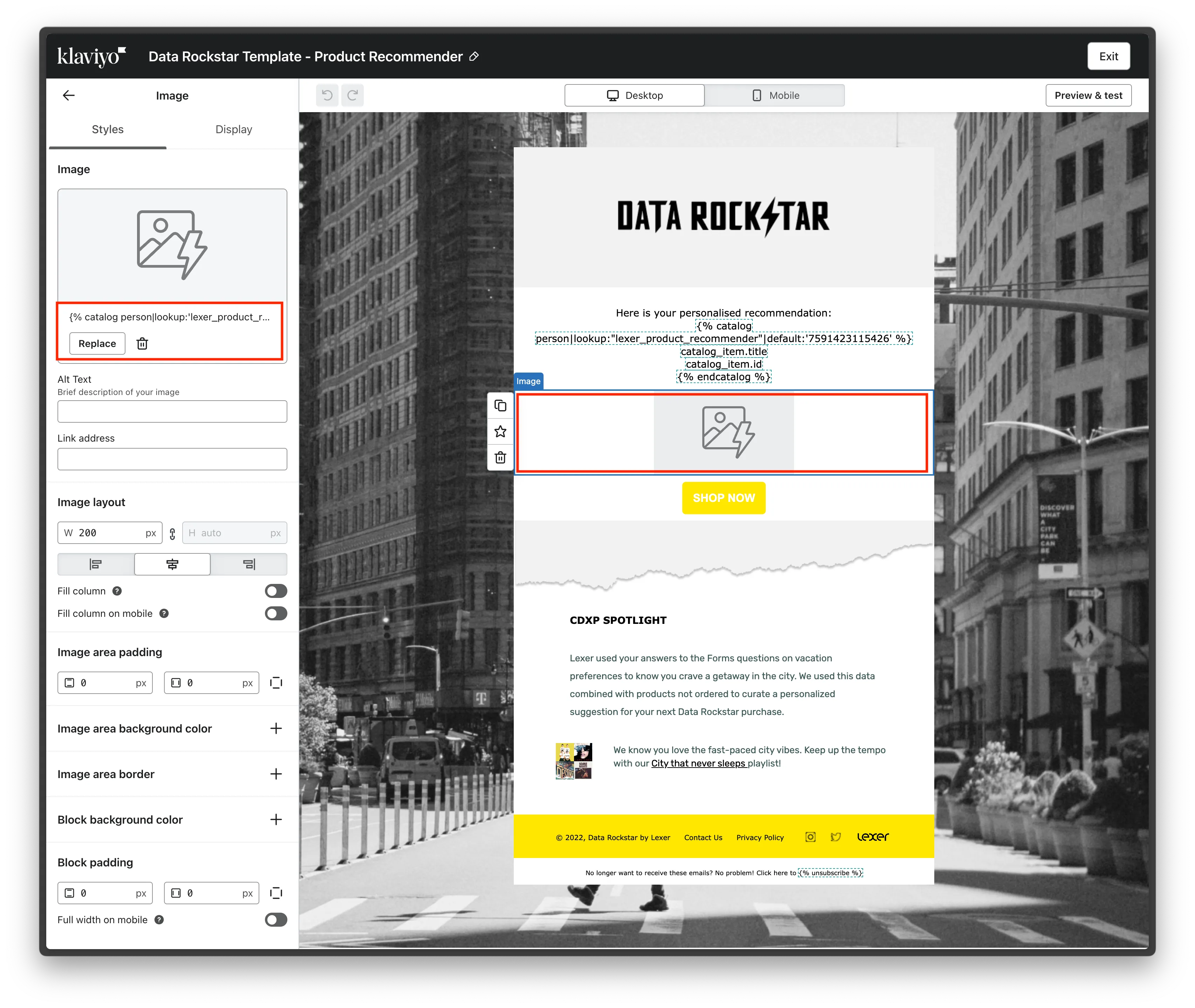 Create a new email template in Klaviyo. In a text block, add this code snippet to look up the lexer_product_recommender property for each customer and load the recommended product from the catalog. Replace {default} with a product id from your catalog as a fallback.